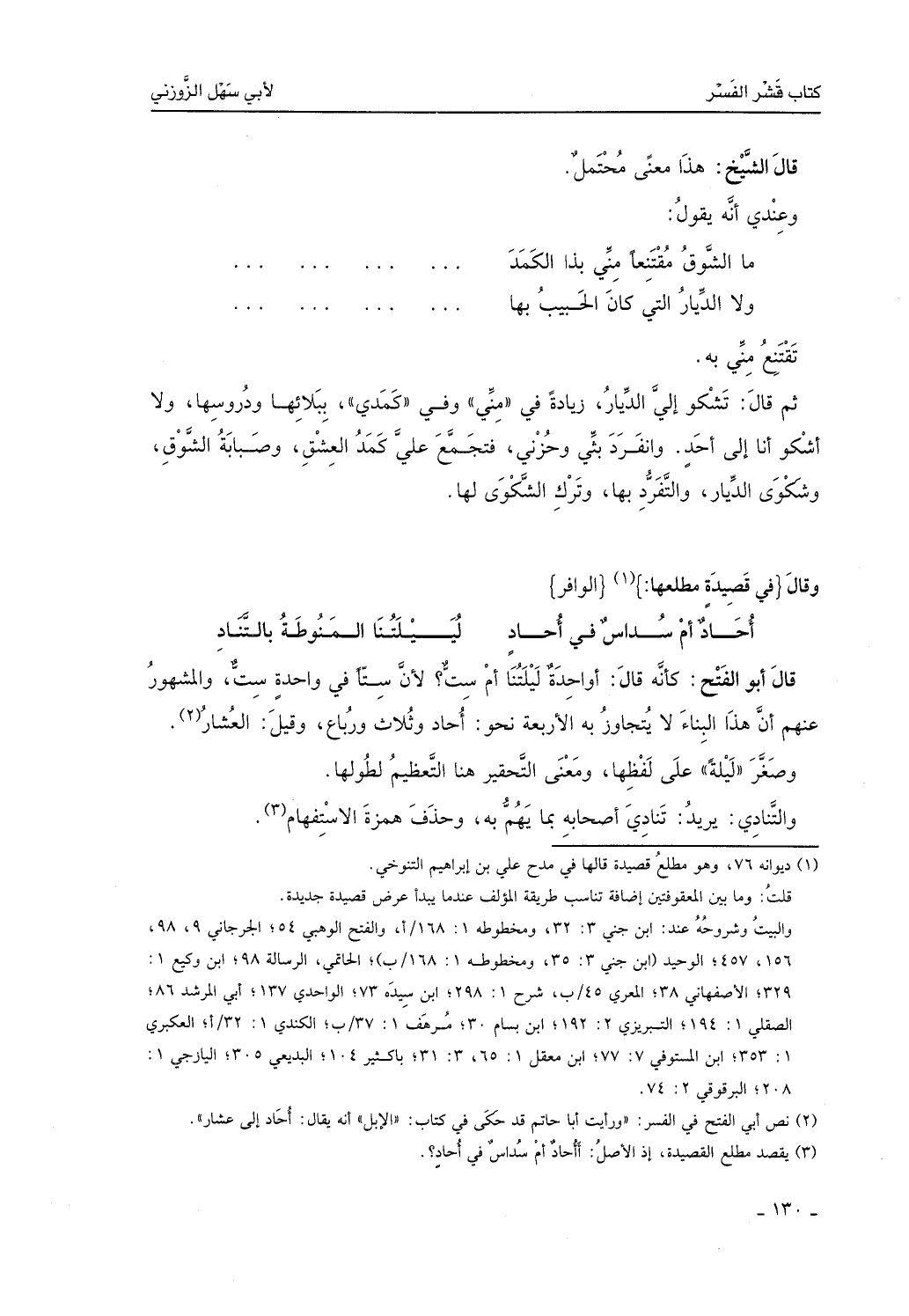 قال الشيخ: هذا معنى محتمل، وعندي أنه يقول: ما الشوق مقتنعاً مني بهذا الكمد، ولا الديار التي كان الحبيب بها تقتنع مني به. ثم قال: تشكو إليّ الديار زيادة في منّي وفي كمدي ببلائها ودروسها، ولا أشكو أنا إلى أحد، وأنفرد ببثي وحزني، فيجتمع عليَّ كمد العشق وصبابة الشوق وشكوى الديار والتفرد بها وترك الشكوى لها.