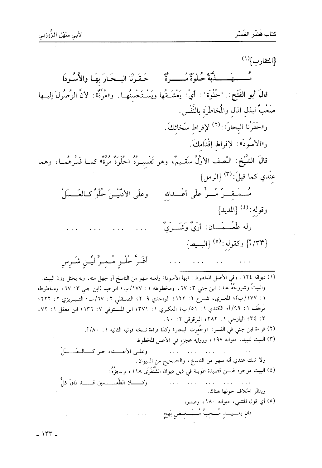 قال أبو الفتح: حلوة، أي: كل أحد يعشقها ويستحسنها، ومرة: لأن الوصول إليها صعب لبذل المال والمخاطرة بالنفس، وحقرنا البحار لإفراط سخائك والأسود لإفراط إقدامك.