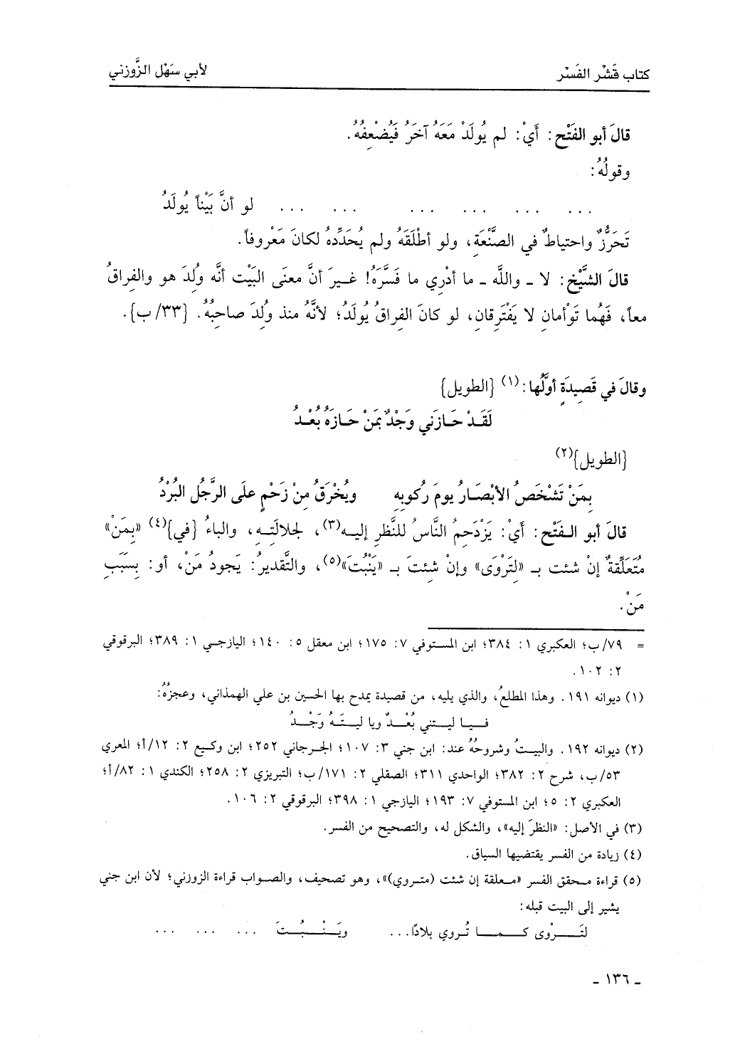 قال الشيخ: لا والله ما درى ما فسره غير أن معنى البيت أنه ولد هو والفراق معاً، فهما توأمان لا يفترقان، لو كان الفراق يولد، لأنه منذ ولد صاحبه.