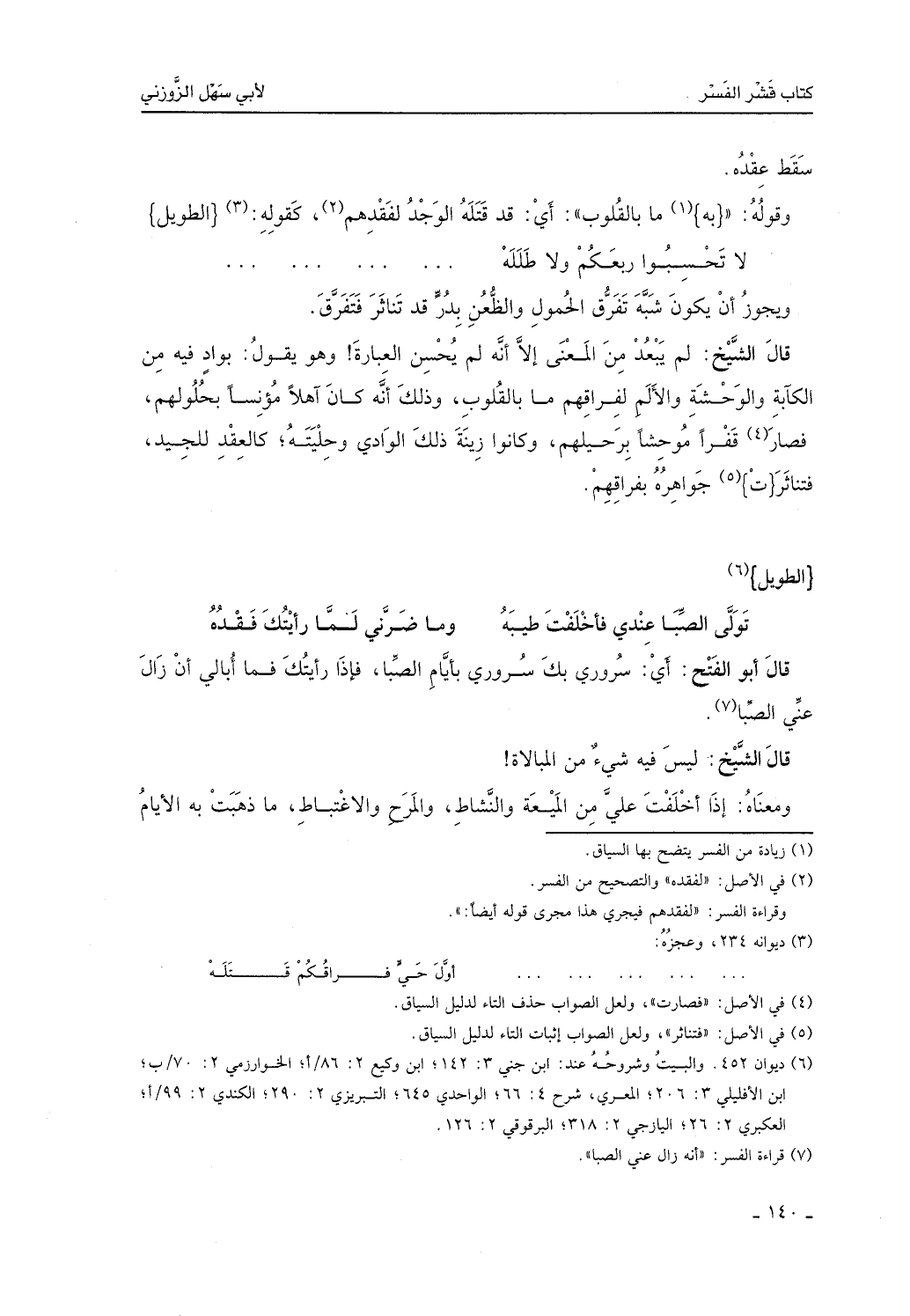 قال الشيخ: لم يبعُد من المعنى إلا أنه لم يحسن العبارة، وهو يقول: بوادٍ، فيه من الكآبة والوحشة والألم لفراقهم ما بالقلوب، وذلك أنه كان آهلاً مؤنساً بحلولهم، فصار قفراً موحشاً برحيلهم، وكانوا زينة ذلك الوادي وحليته، وكالعقد للجيد، فتناثرت جواهره بفراقهم.