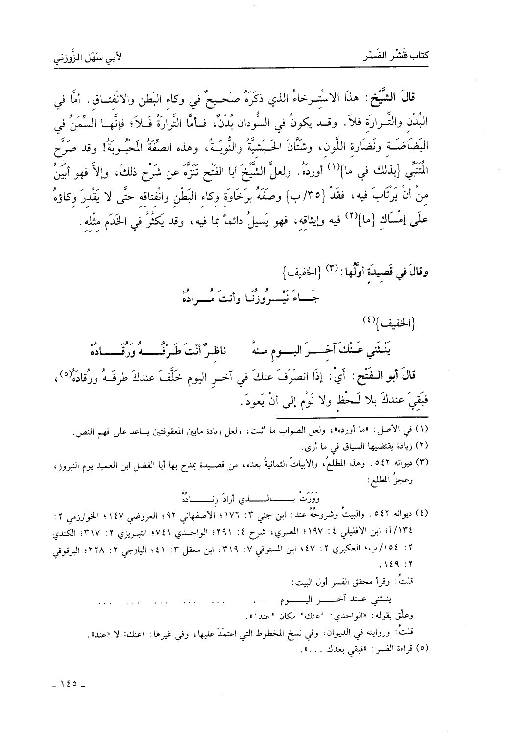 قال الشيخ: هذا الاسترخاء الذي ذكره صحيح في وكاء البطن والانفتاق أيضاً، فأما في البُدن والترارة فلا، وقد يكون في السُّودان بُدن، فأما الترارة فلا، فإنها السمن في البضاضة ونضارة اللون، وشتان الحبشية والنُّوبة، وهذه الصفة محبوبة. وقد صرح المتنبي ما أورده. ولعل الشيخ أبا الفتح تنزه عن شرح ذلك، وإلا فهو أبين من أن يرتاب فيه، فقد وصفه برخاوة وكاء البطن وإنفتاقه حتى لا يقدر وكاؤه على إمساك ما فيه وإيثاقه، فهو يسيل دائماً بما فيه، وقد يكثر في الخدم مثله.