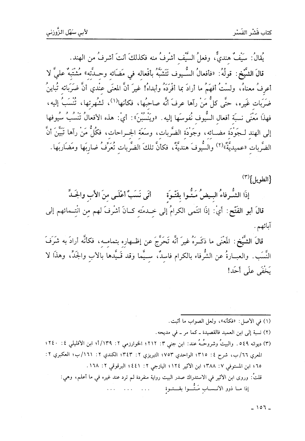 قال الشيخ: قوله فأفعال السيوف تتشبه بأفعاله في مضائه وحدته مشتبه عليَّ، لا أعرف معناه، ولست أفهم ما أراد بما أفرده وأبداه، غير أن المعنى عندي أن ضرباته تُباين ضربات غيره حتى كل من رآها عرف أنه صاحبها، فكأنه لشهرتها تُنسب إليه، فهذا معنى نسبته أفعال السيوف نفوسها إليه. وينسبن، أي: هذه الأفعال تُنسب سيوفها إلى الهند لجودة مضائه وجودة الضربات وسعة الجراحات، فكل من رآها تبين أن الضربات عميدية، والسيوف هندية، فكأن تلك الضربات تعرف ضاربها ومضاربها.