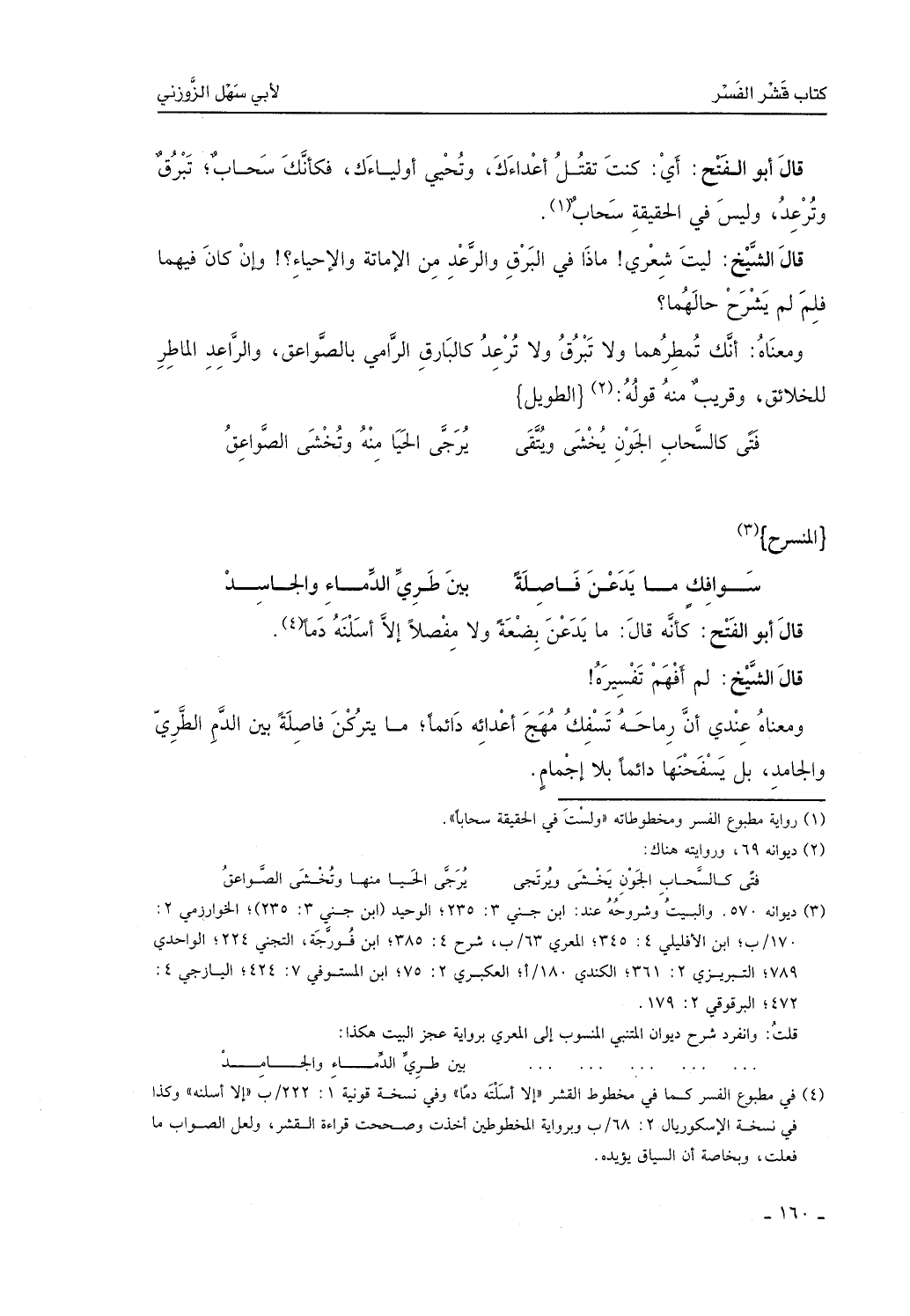 قال الشيخ: لم أفهم تفسيره، ومعناه عندي: إن رماحه تسفك مُهج أعدائه دائماً، ما يتركن فاصلة بين الدم والطَّري والجامد، بل يسفحنها دائماً بلا إجمام.