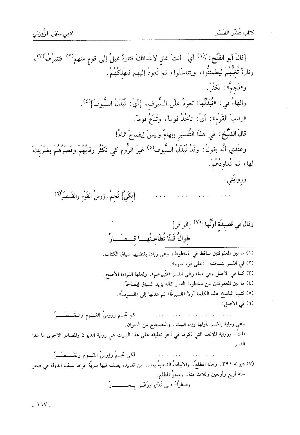 قال الشيخ في هذا التفسير إبهام، وليس إيضاح تمام، وعندي أنه يقول: وقد تُبدل السيوف غير الروم كي تكثر رقابهم وقصرهم بضربك لها، ثم تعاودهم، وروايتي: كم تجمُّ رؤوس القوم والقصر.