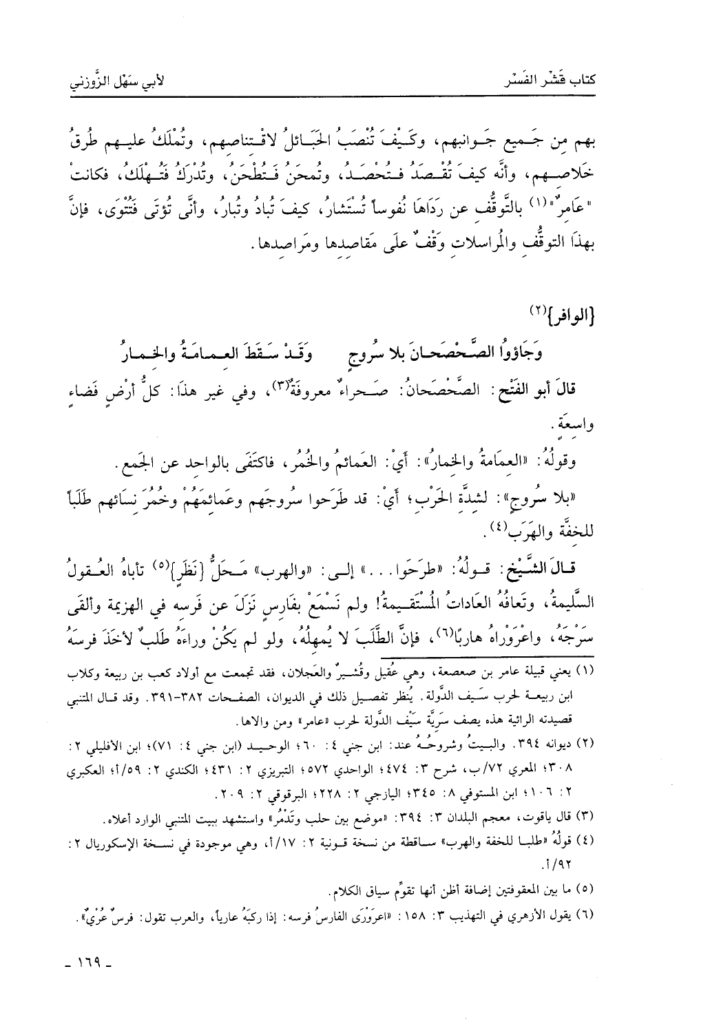 قال الشيخ: قوله طرحوا إلى والهرب محل تأباه العقول السليمة وتعافه العادات المستقيمة، ولم نسمع بفارس نزل عن فرسه في الهزيمة، وألقى سرجه واعروراه هارباً، فإن الطلب لا يمهله، ولو لم يكن وراءه طلب لأخذ فرسه