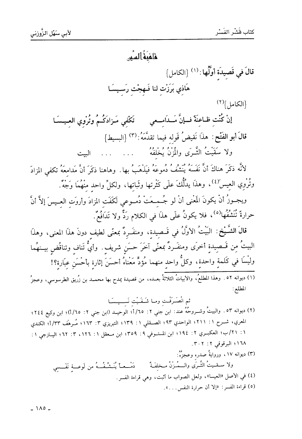 قال الشيخ: البيت الأول في قصيدة، ومنفرد بمعنى لطيف دون هذا المعنى، وهذا البيت في قصيدة أخرى ومنفرد بمعنى أخر حسنٍ شريف، وأي تنافٍ وتناقض بينهما، وليسا في كلمة واحدة، وكل واحد منهما مؤدٍّ معناه أحسن إثارة بأحسن عبارة؟