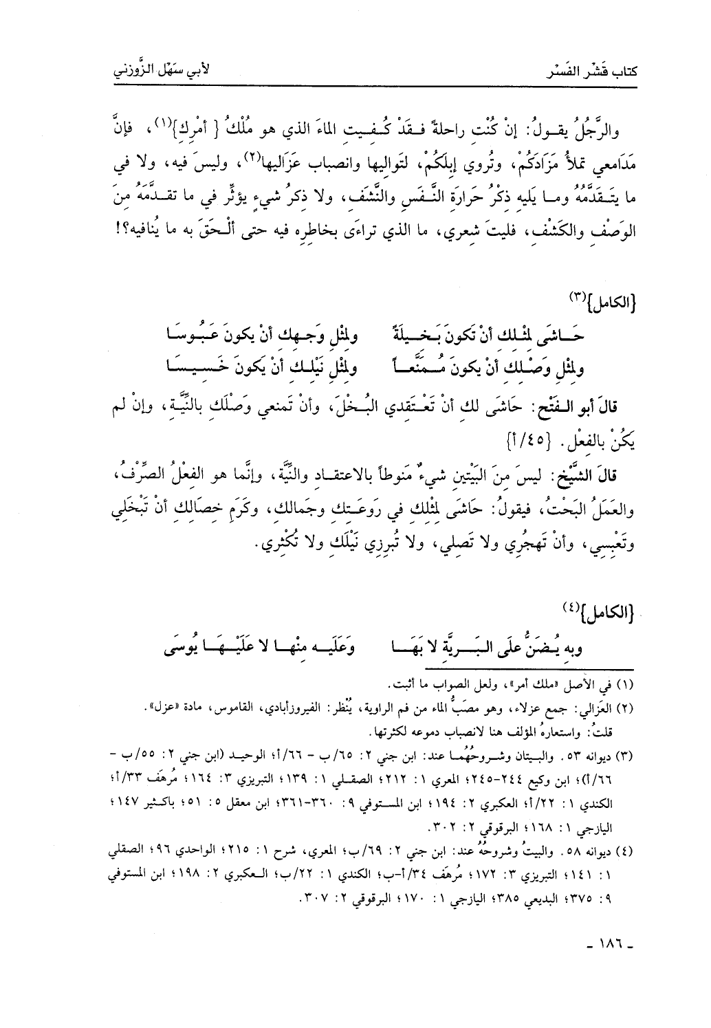 وما يليه ذكر حرارة النفس والنَّشف ولا ذكر شيءٍ يؤثر فيما تقدم من الوصف والكشف، فليت شعري ما الذي تراءى بخاطره فيه حتى ألحق به ما ينافيه؟