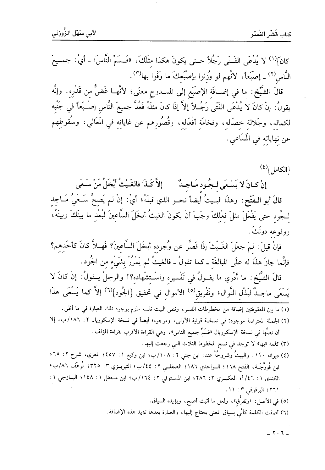 قال الشيخ: ما ادري ما يقول في تفسيره واستشهاده، والرجل يقول: إن كان لا يسعى ماجدٌ لبذل النَّوال وتفرَّق الأمور في تحقيقٍ إلا كما يسعى هذا