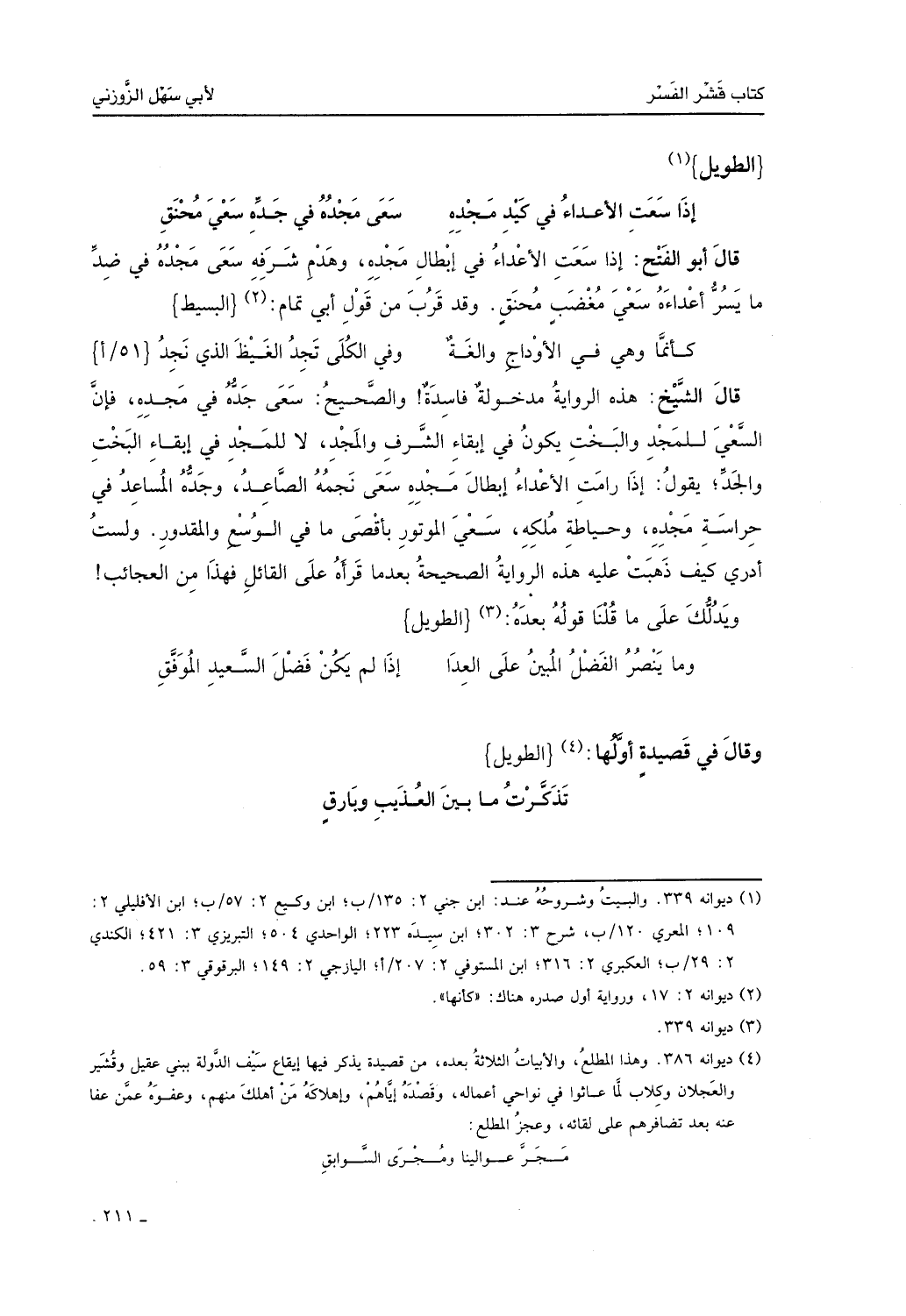 قال الشيخ: هذه الرواية مدخولة فاسدة، والصحيح سعى جده في مجده، فإن السعي للجد والبخت يكون في إبقاء الشرف والمجد لا للمجد في إبقاء البخت والجد. يقول: إذا أرادت الأعداء إبطال مجده سعى نجمه الصاعد وجدُّه المساعد في حراسة مجده وحياطة ملكه سعي الموتور بأقصى ما في الوسع والمقدور، ولست أدري كيف ذهبت عليه هذه الرواية الصحيحة بعدما قرأه على القائل، فهذا أمر العجائب؟ ويدلُّك على ما قلنا قوله بعده: