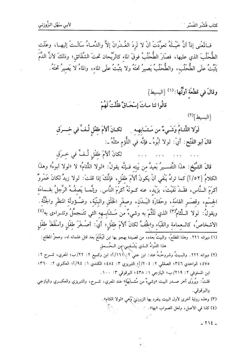 قال الشيخ: هذا التفسير بعيد من بيته، فإنه يقول: لولا اللئام لا لولا أبوه، وهذا الكلام كما تراه ينفي عنه أن يكون ألأم طفلٍ، فإنك إذا قلت: لولا زيدُ لكان عمروٌ أكرم الناس، فقد نفيت بزيدٍ عنه كونه أكرم الناس، وإنما يصف الرجل بقماءة الجسم وقصر القامة وحقارة البدن وصغر الخلق والبُنية وضؤولة المنظر والجثة، ويقول: لولا اللِّثام الذي تلثم به وشيءُ من مشابهه التي تتجمل وتتراءى به الأشخاص كالعمامة والقباء والخُفِّ لكان ألأم طفلٍ، أي أصغر طفلٍ وأسقط طفلٍ