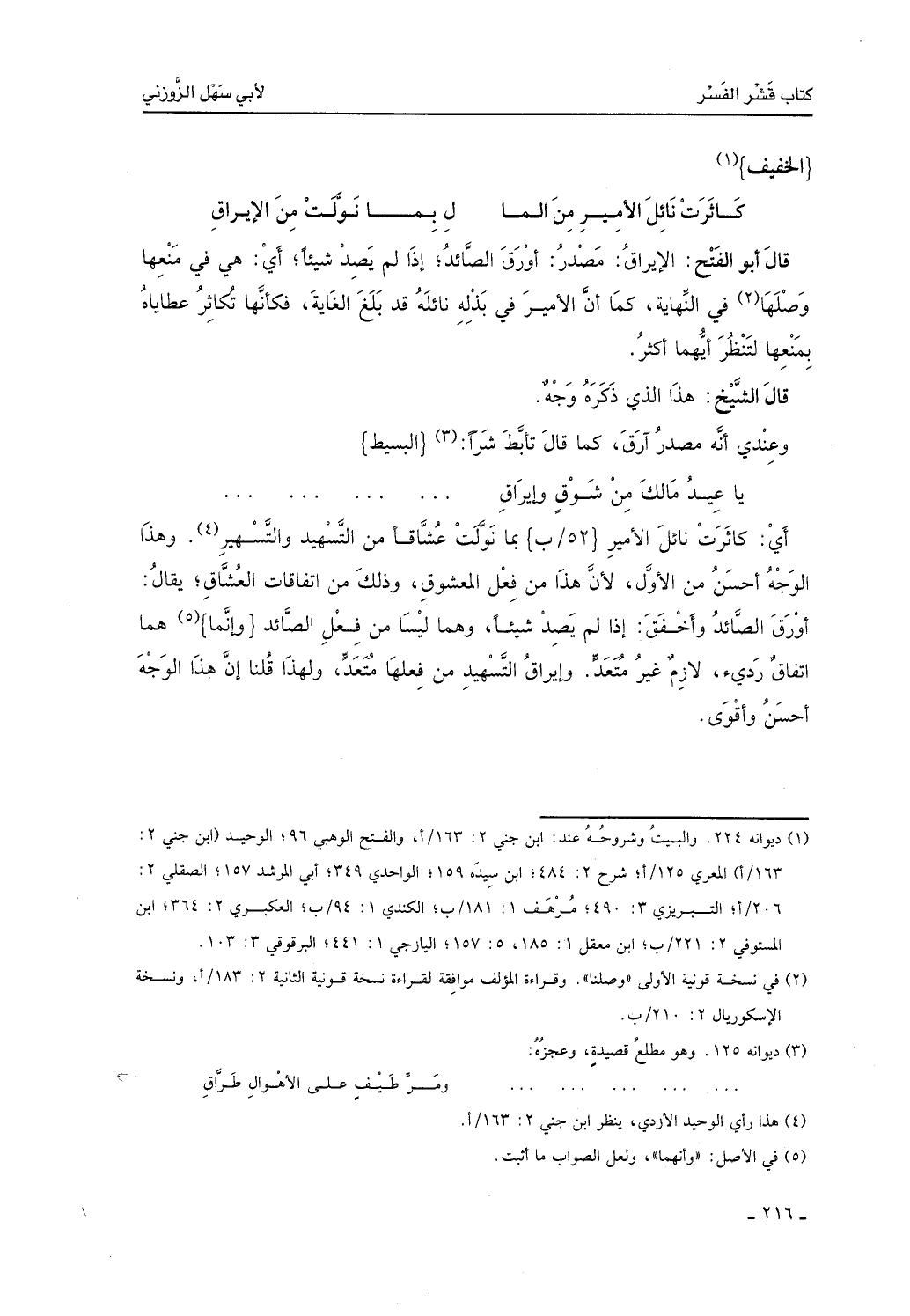 قال أبو الفتح: الإيراق: مصدر أورق الصائد يورق إيراقاً إذا لم يصد شيئاً. أي: هي في منعها وصلها في النهاية كما أن الأمير في بذله نائله قد بلغ الغاية، فكأنها تُكاثر عطاياه بمنعها لتنظر أيهما أكثر.