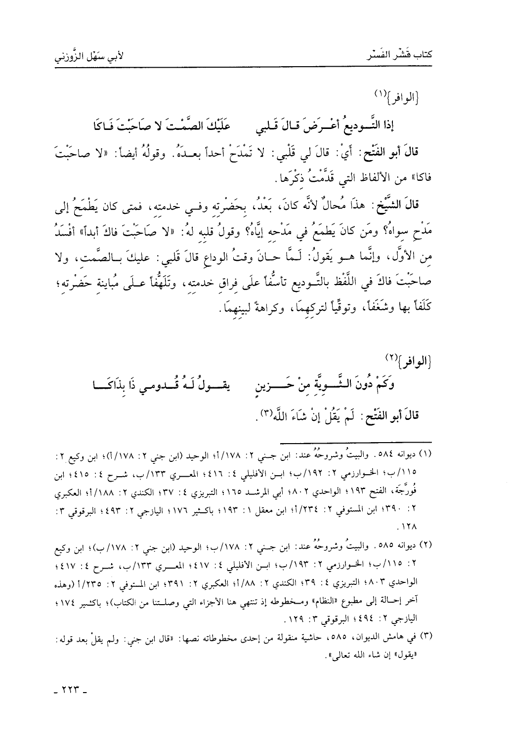 قال الشيخ: هذا محال، لأنه كان يعدُّ لحضرته وفي خدمته، فمتى كان يطمح إلى مدح سواه؟ ومن كان يطمع في مدحه إياه؟ وقول قلبه: لا صاحبت فاكا أبداً أفسد من الأول، وإنما هو يقول: لما حان وقت الوداع قال قلبي: عليك بالصمت، ولا صاحبت فاك في اللَّفظ بالتَّوديع تأسُّفاً على فراق خدمته وتلهُّفاً على مباينة حضرته كلفاً بها وشغفاً وتوقِّياً لتركهما وكراهة لبينهما.