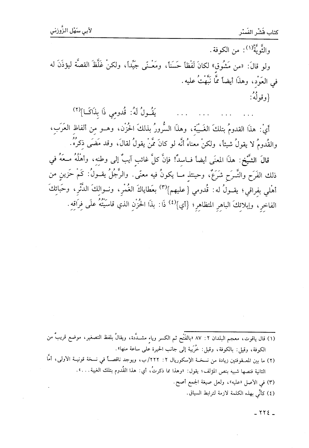 والثَّويَّة من الكوفة، ولو قال: من مشوق لكان لفظاً حسناً ومعنى جيداً، ولكن غلَّظ القصة ليؤذن له في العودِ، وهذا أيضاً مما نبَّهت عليه، وقوله: قدومي ذا بذاكا أي: هذا القدوم بتلك الغيبة، وهذا السرور بذلك الحزن، وهو من ألفاظ