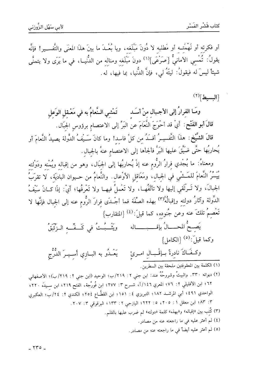 قال الشيخ: هذا التفسير أفسد من كل فاسد، وما كان سيف الدولة يصيد النعام، أي يحاربها حتى ضيق عليها البر، فألجأها إلى الاعتصام عنه بالجبال، ومعناه ما يجدي فرارُ الروم عنه إذ يحاربها إلى الجبال، وهو من إقباله ويُمنه ودولته ييسِّر النَّعام للمشي في الجبال ومعاقل الأوعال. والنعام من الحيوان البادية لا تقرب الجبال، ولا ترتقي إليها، ولا تألفها، ولا تعمل فيها، ولا تعرفها، أي: إذا كان سيف الدولة وآثار دولته وإقباله بهذه الصفة، فما أجدى فرار الروم عنه إلى الجبال، فإنها لا تعصم تلك عنه وعن جنوده كما قيل: