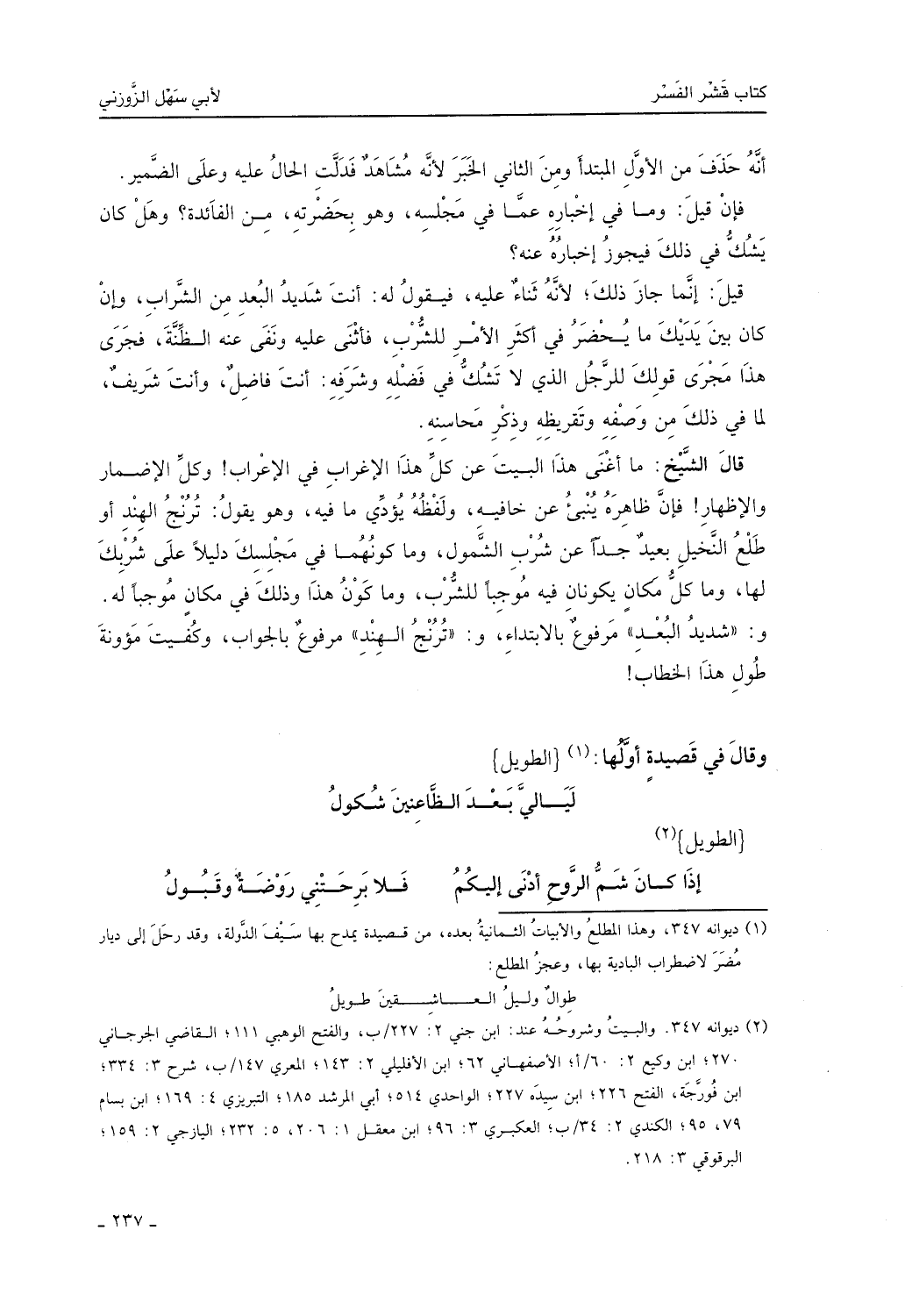 قال الشيخ: ما أغنى هذا البيت عن كل هذا الإغراب في الإعراب وكل الإضمار والإظهار، فإن ظاهره ينبئ عن خافيه ولفظه يؤدي ما فيه. وهو يقول: ترنجُ الهند أو طلع النخيل بعيد جداً عن شرب الشَّمول وما كونهما في مجلسك دليلاً على شربك لها، وما كل مكان يكونان فيه موجب للشراب وما كون هذا وذلك في مكان موجباً له. وشديد البُعد مرفوع بالابتداء وترنجُ الهند مرفوع بالجواب، وكُفيت مؤونة طول هذا الخطاب؟