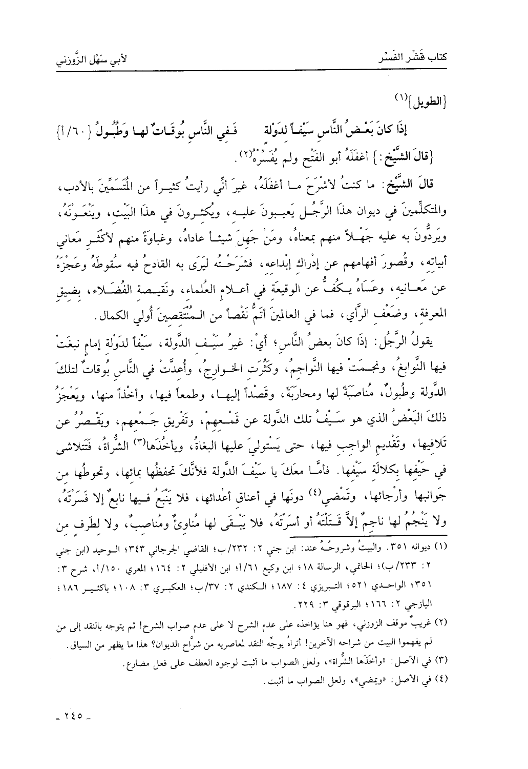 أغفله أبو الفتح، ولم يفسره. قال الشيخ: ما كنت لأشرح ما أغفله، غير أني رأيت كثيراً من المتَّسمين بالأدب والمتكلمين في ديوان هذا الرجل يعيبون عليه ويكثرون في هذا البيت، وينعونه، ويردون به عليه جهلاً منهم بمعناه، ومن جهل شيئاً عاداه، وغباوة منهم لأكثر معاني أبياته وقصور إفهامهم عن إدراك إبداعه، فشرحته ليرى به القادح فيه سقوطه وعجزه عن معانيه، وعساه يكفُّ عن الوقيعة في أعلام العلماء ونقيصة الفضلاء بضيق المعرفة وضعف الرأي، فما في العالمين أتمُّ نقصاُ من المنتقِّصين أولي الكمال. يقول الرجل: إذا كان بعض الناس، أي: غير سيف الدولة سيفاً لدولة إمامٍ نبغت فيها النوابغ، ونجمت فيها النَّواجم، وكثرت فيها الخوارج، وأعدَّت في الناس بوقاتٍ لتلك الدولة وطبول مناصبةٍ لها ومحاربةٍ، وقصداً إليها وطمعاً فيها وأخذاً منها، ويعجز ذلك البعض الذي هو سيف تلك الدولة عن قمعهم وتفريق جمعهم، ويقصِّر عن تلافيها وتقديم الواجب فيها حتى يستولي عليها البغاة، ويأخذها الشُّراة، فتتلاشى في حيفها بكلالة سيفها، فأما معك يا سيف الدولة فلأنك تحفظها بمائها، وتحوطها من جوانبها وأرجائها، وتمضي دونها في أعناق أعدائها، فلا ينبغُ فيها نابغٌ إلا قسرته، ولا ينجم لها ناجم إلا قتلته أو أسرته، فلا يبقى لها مُناوئٌ مناصبٌ، ولا لطرفٍ من