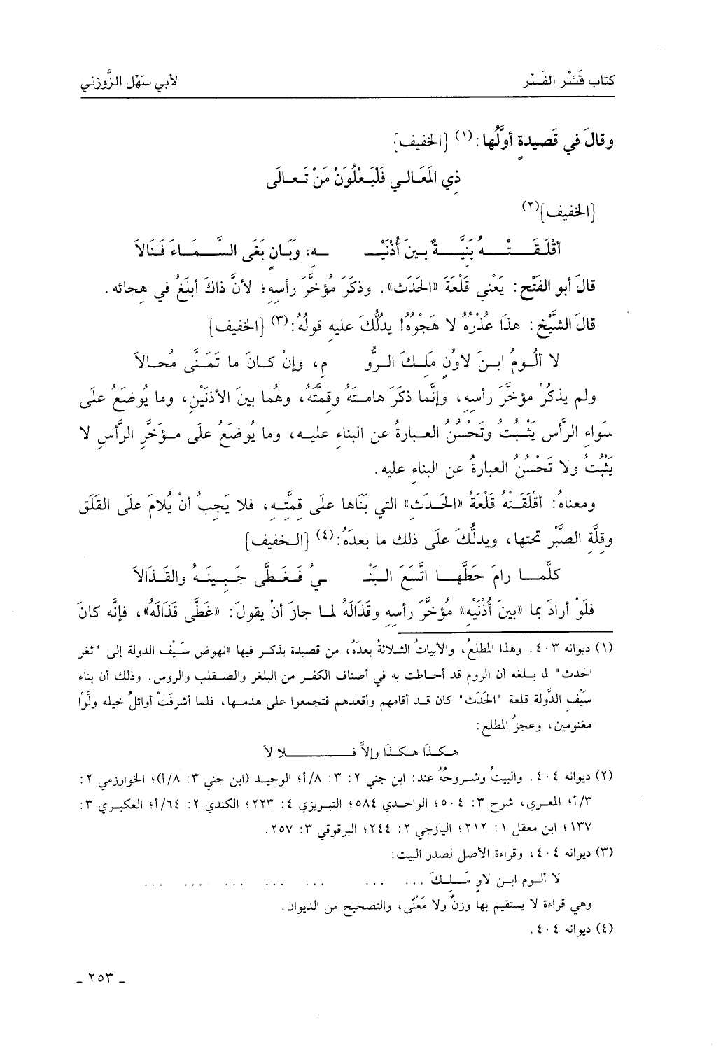 قال أبو الفتح: يعني قلعة الحدَثِ، وذكر مؤخر رأسه، لأن ذلك أبلغ في هجائه.