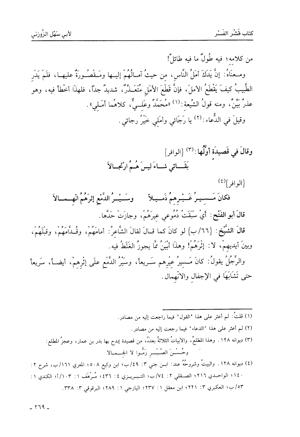 من كلامه فيه طُول ما فيه طائل، ومعناه: أن يدك أمل الناس من حيث آمالهم إليها ومقصورة عليها، فلم يدر الطبيب كيف يقطع الأمل، فإن قطع الأمل متعذر شديد جداً، فلهذا أخطأ فيه، وهو عذر بينٌ، ومنه قول الشِّيعة: