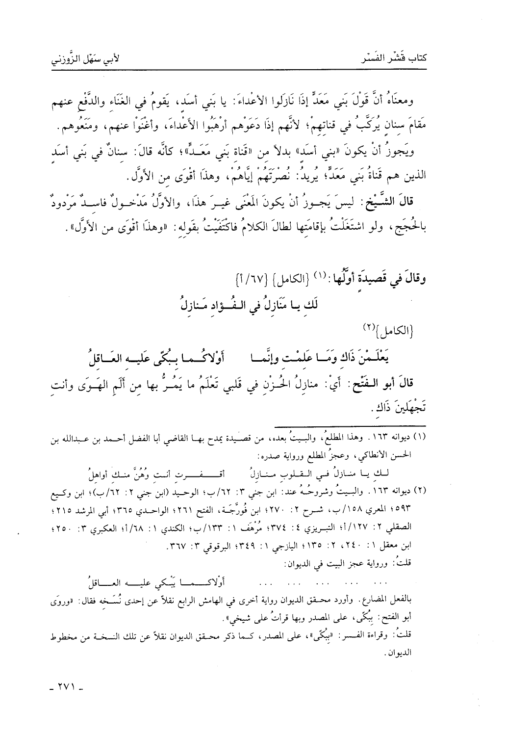 قال أبو الفتح: أي منازل الحزن في قلبي تعلم ما يمرُّ بها من أمل الهوى، وأنتِ تجهلين ذاك.