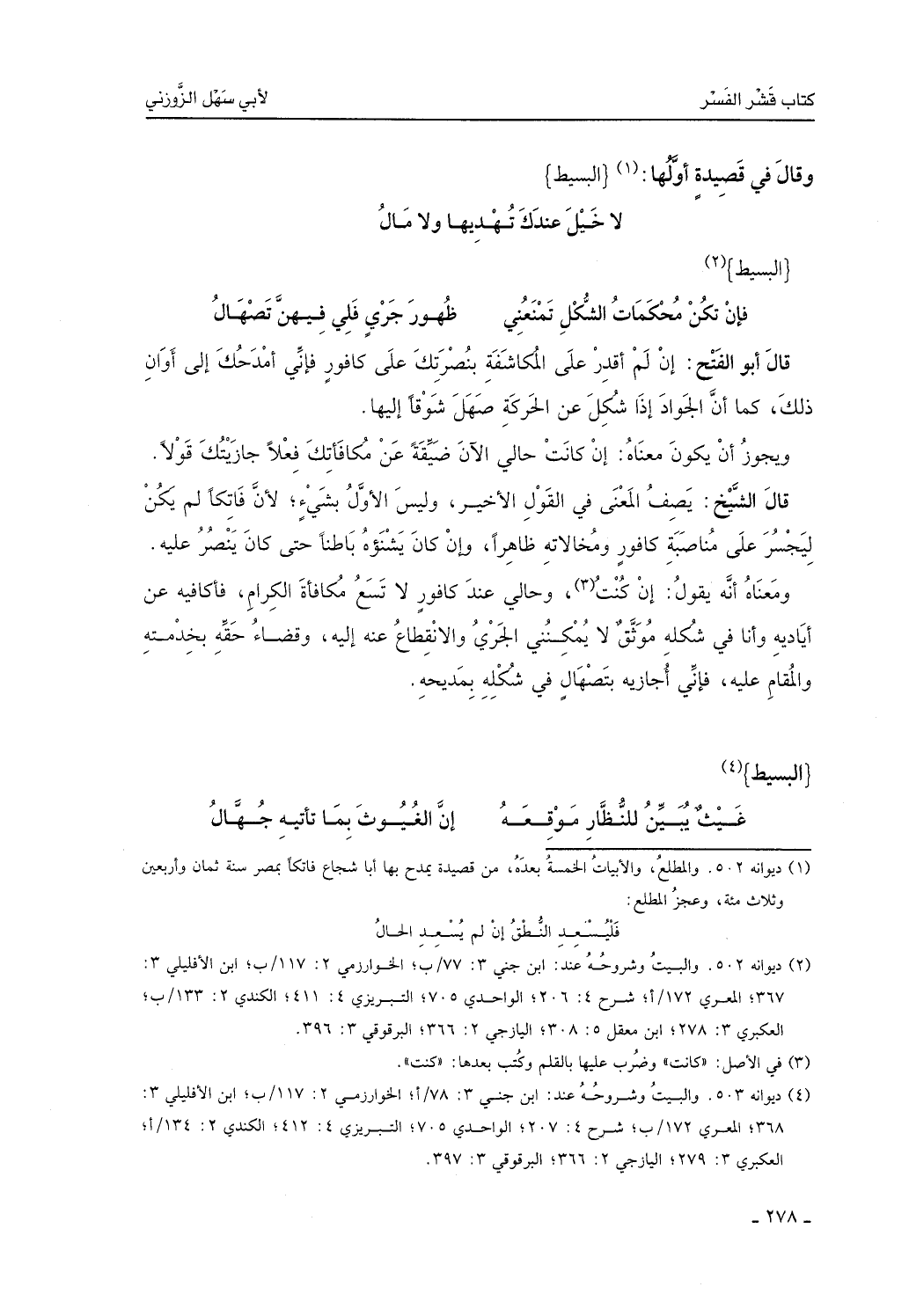 قال الشيخ: يصف المعنى في القول الأخير، وليس الأول بشيءٍ، لأن فاتكاً لم يكن ليجسر على مناصبة كافور وممالأته ظاهراً، وإن كان يشنؤه باطناً حتى كان ينصر عليه، ومعناه أنه يقول: إن كنت وحالي عند كافور لا تسع مكافأة الكرام فأكافئه عن أياديه، وأنا في شُكله موثقٌ لا يمكنني الجري والانقطاع عنه إليه وقضاء حقه بخدمته والمقام عليه، فإني أجازيه بتصهالٍ في شُكله بمديحه.