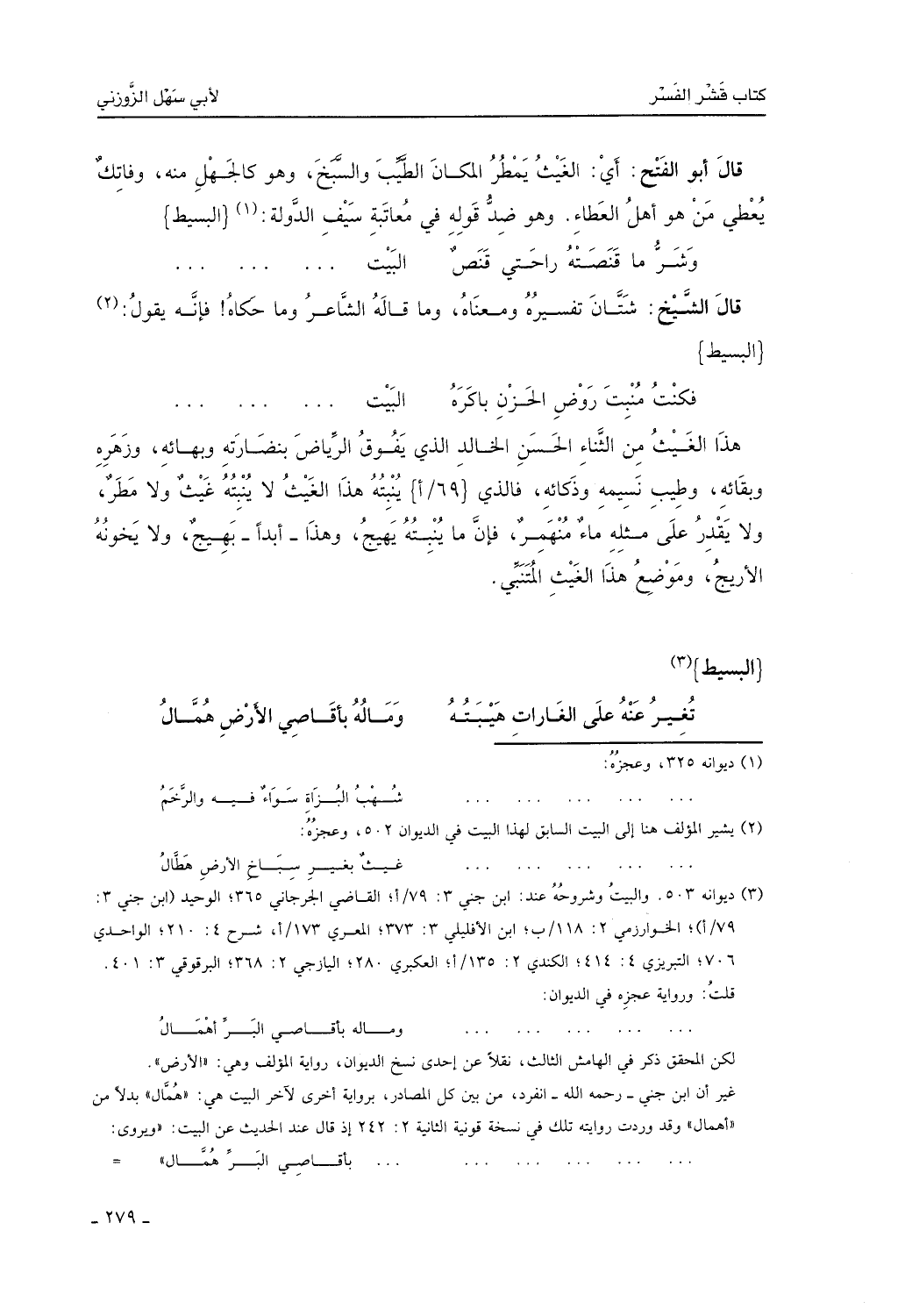 قال الشيخ: شتان تفسيره، ومعناه، وما قاله الشاعر وما حكاه، فإنه يقول: فكنت منبت روضٍ الحزن باكره. . . البيت، هذا الغيث من الثناء الحسن الخالد الذي يفوق الرياض بنضارته وبهائه وزهره وبقائه وطيب نسيمه وذكائه، فالذي ينبته هذا الغيث لا يُنبته غيثٌ ولا مطرٌ، ولا يقدر على مثله ماء منهمر، فإن ما يُنبته يهيج، وهذا أبداً بهيجٌ، ولا يخونه الأريج، وموضع هذا الغيث المتنبي.