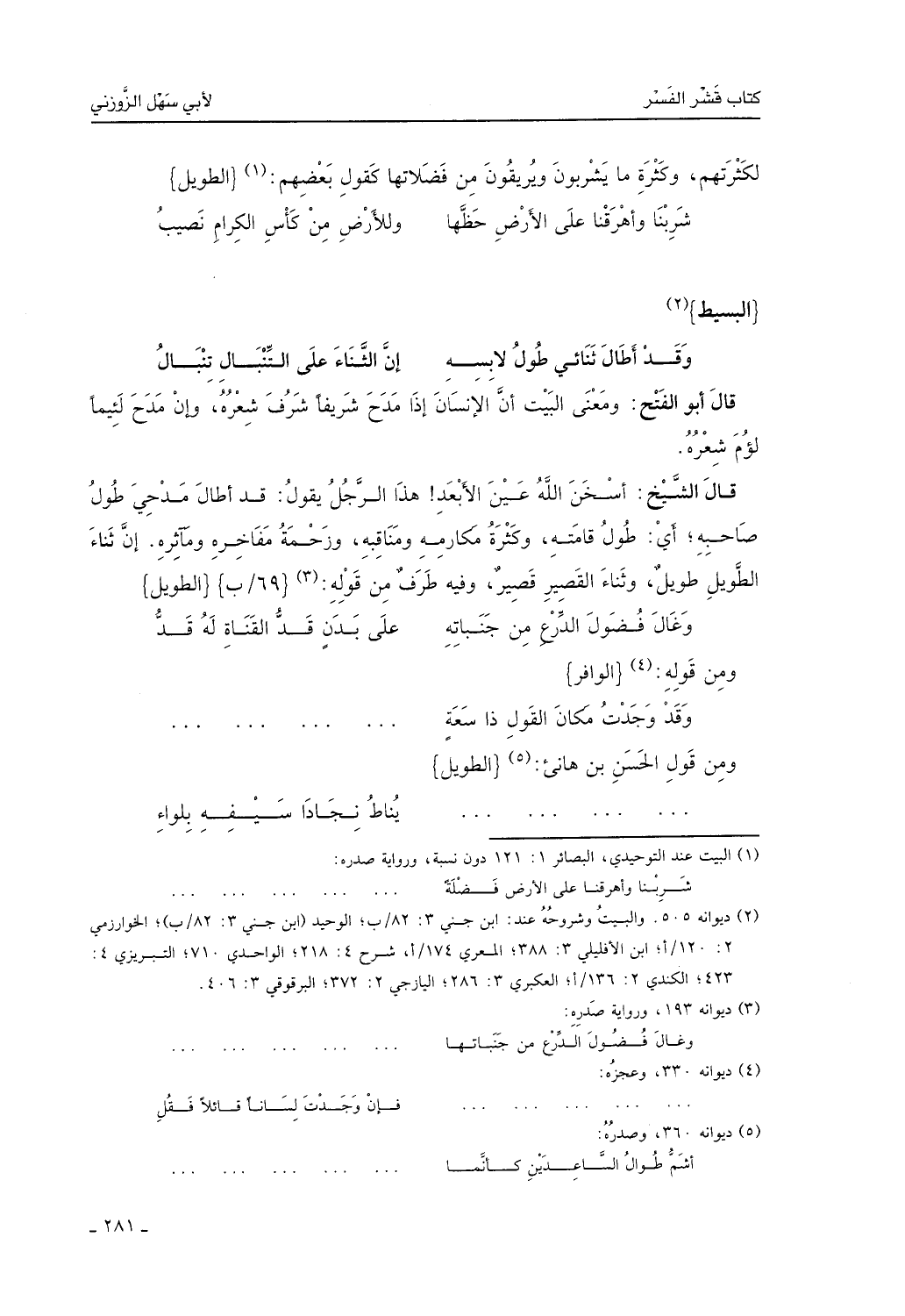 قال الشيخ: أسخن الله عين الأبعد، هذا الرجل يقول: قد أطال مدحي طول صاحبه: أي: طول قامته وكثرة مكارمه ومناقبه وزحمة مفاخره ومآثره. إن ثناء الطويل طويل، وثناء القصير قصير، وفيه طرفٌ من قوله: