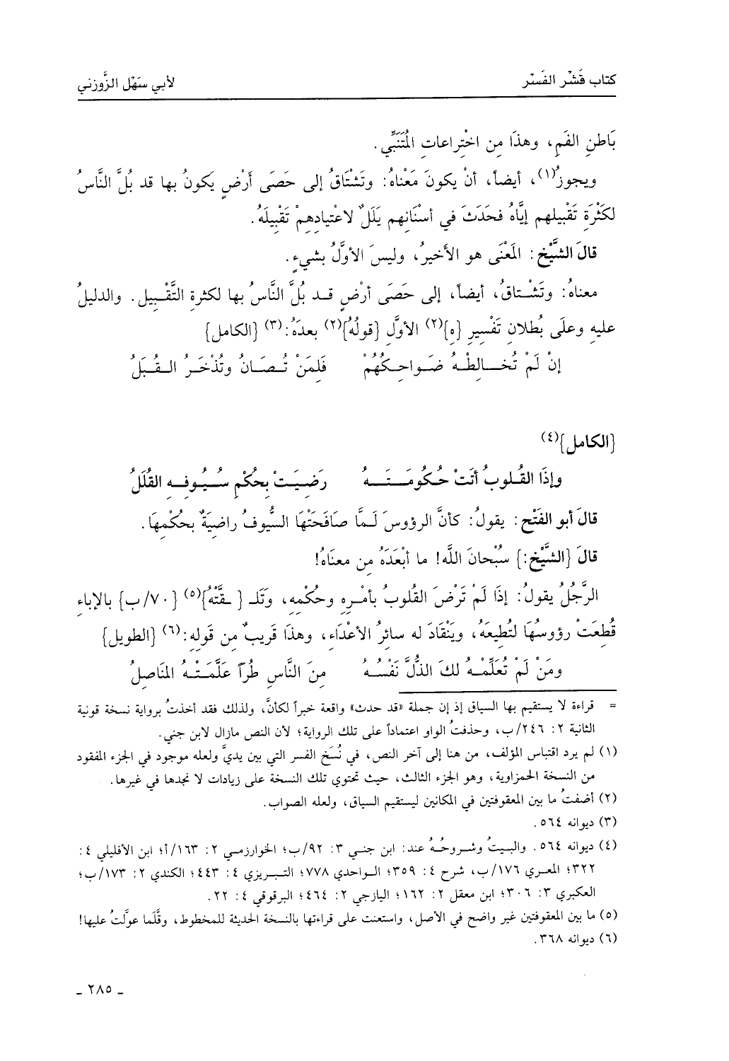 قال الشيخ: سبحان الله ما أبعده من معناه. الرجل يقول: إذا لم ترضَ القلوب بأمره وتلقته بالإباء قطعت رؤوسها لتطيعه وتنقاد له سائر الأعداء، وهذا قريب من قوله: