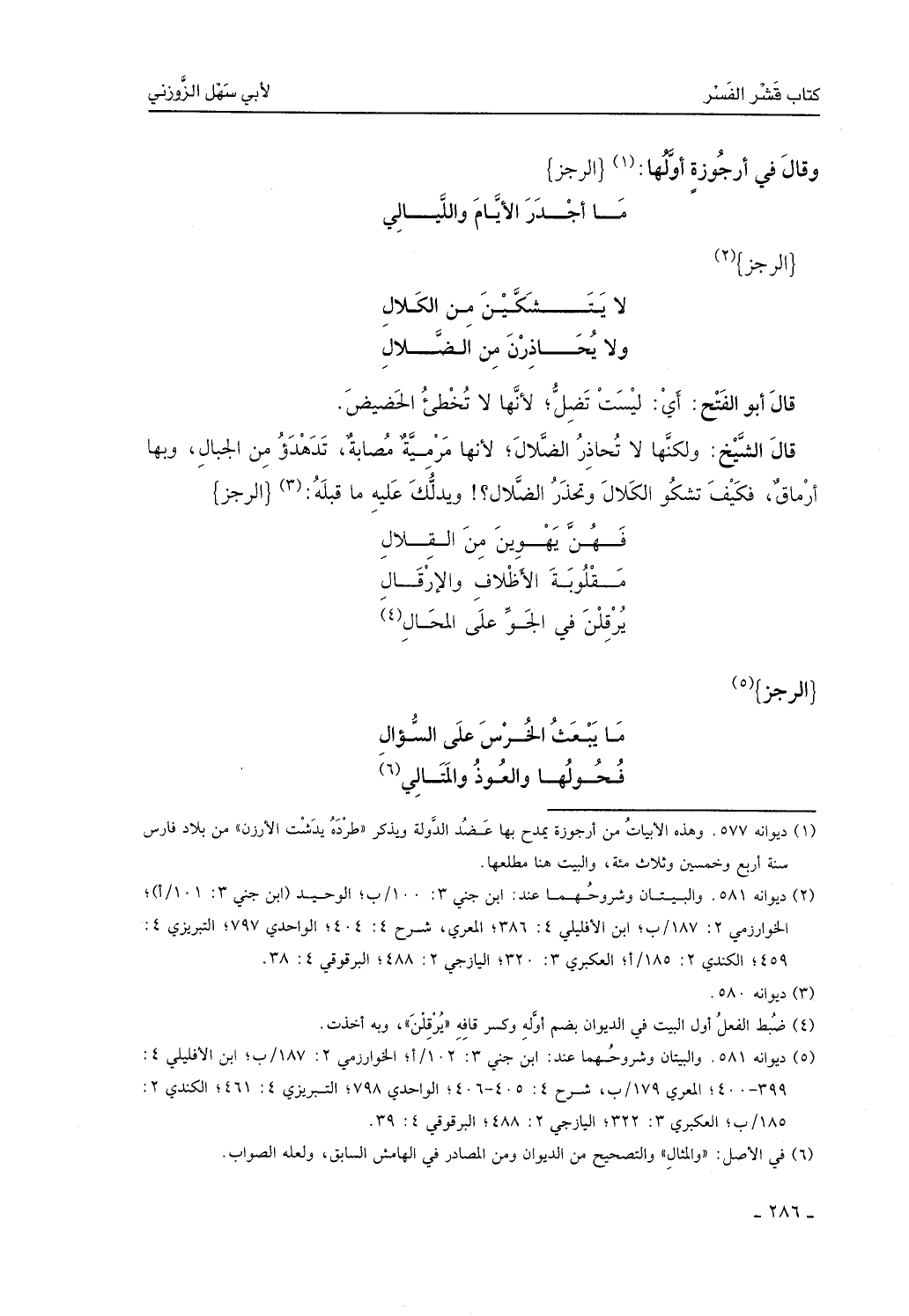 (لا يَتشكَّيْنَ منَ الكَلالِ ... ولا يُحاذِرْنَ منَ الضَّلالِ)