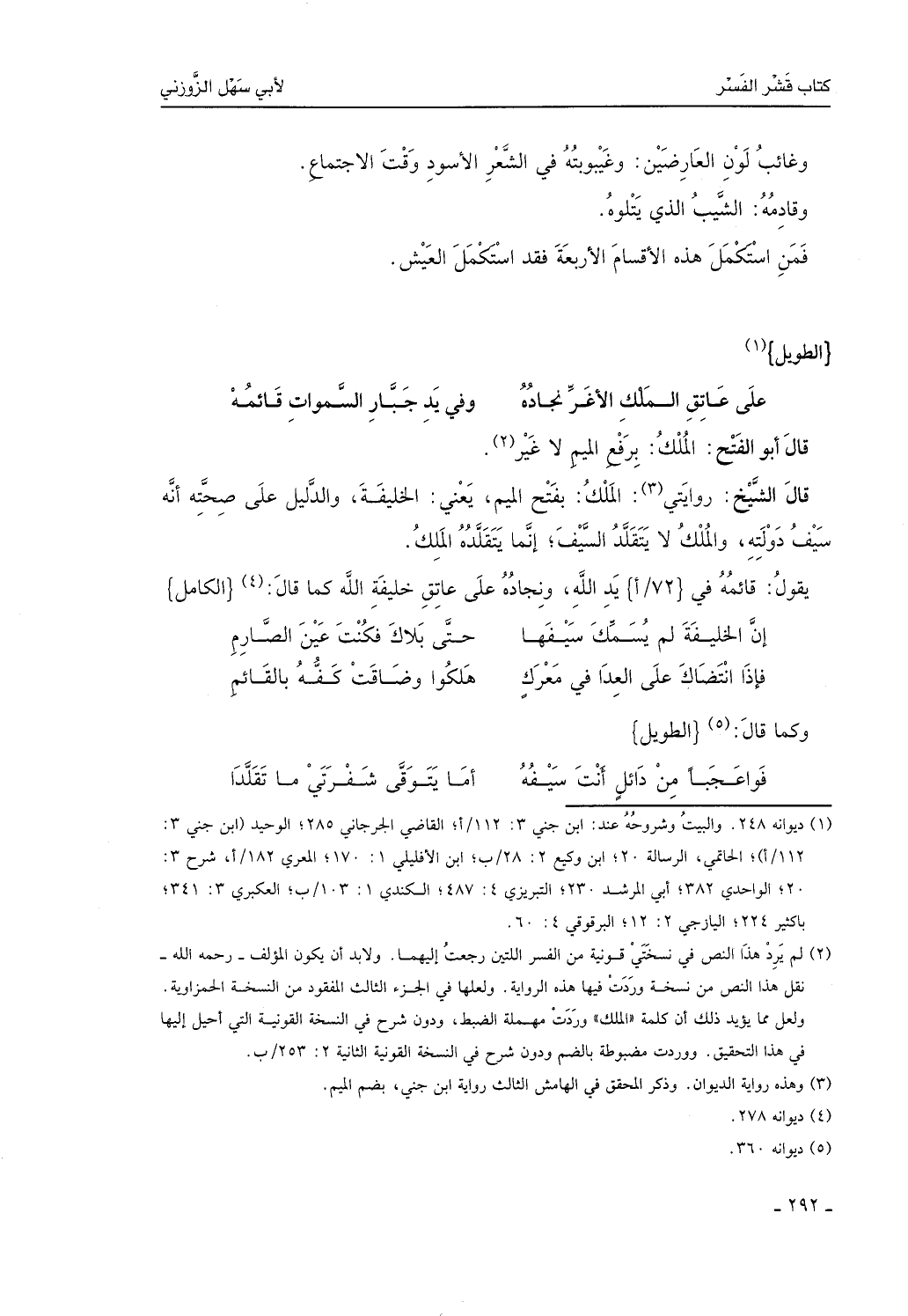 قال الشيخ: روايتي الملك بفتح الميم، يعني الخليفة، والدليل على صحته أنه سيف دولته، والمُلك لا يتقلَّد السيف، إنما يتقلَّده المّلك. يقول: قائمه في يد الله ونجاده على عاتق خليفة الله، كما قال: