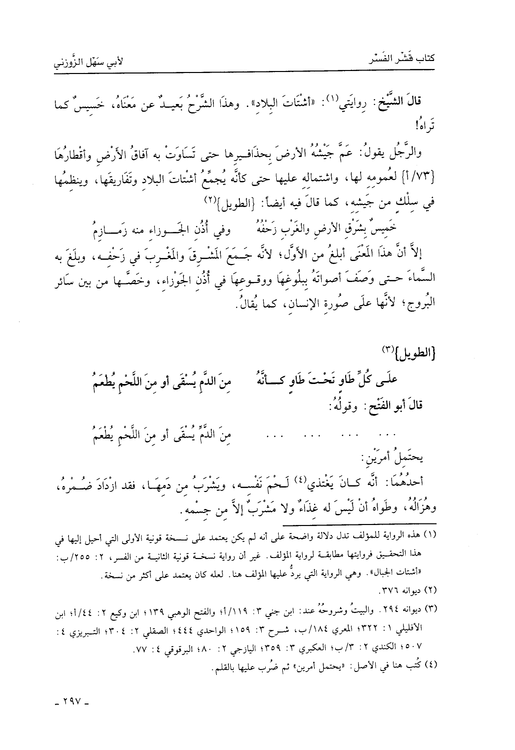 قال الشيخ: روايتي أشتات البلاد، وهذا الشرح بعيد من معناه خسيس كما تراه، والرجل يقول: عمَّ جيشه الأرض بحذافيرها حتى تساوت به آفاق الأرض وأقطارها لعمومه لها واشتماله عليها حتى كأنه يجمع أشتات البلاد وتفاريقها وينظمها في سلك من جيشه كما قال أيضاً فيه: