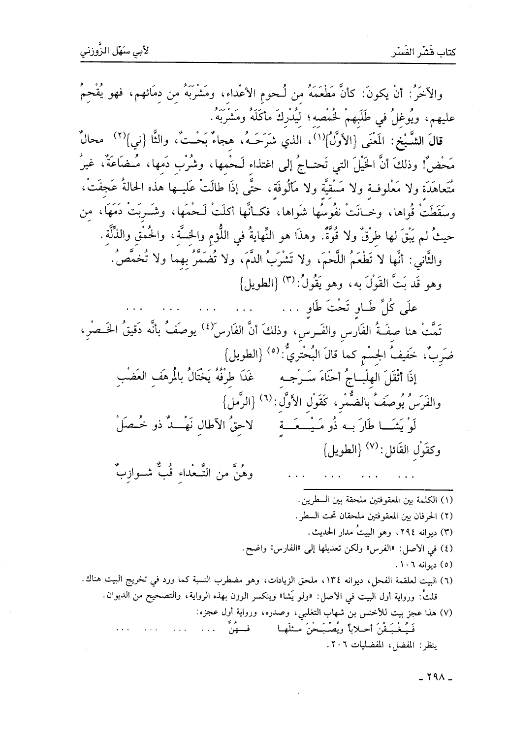 والثاني أنها لا تُطعم اللحم ولا تشرب الدَّم ولا تُضمر بهما ولا تُخمَّص، وهو قد بتَّ القول به، وهو يقول: على كل طاوٍ تحت طاوٍ، وتمت هنا صفة الفارس والفرس، وذلك أن الفارس يوصف بأنه دقيق