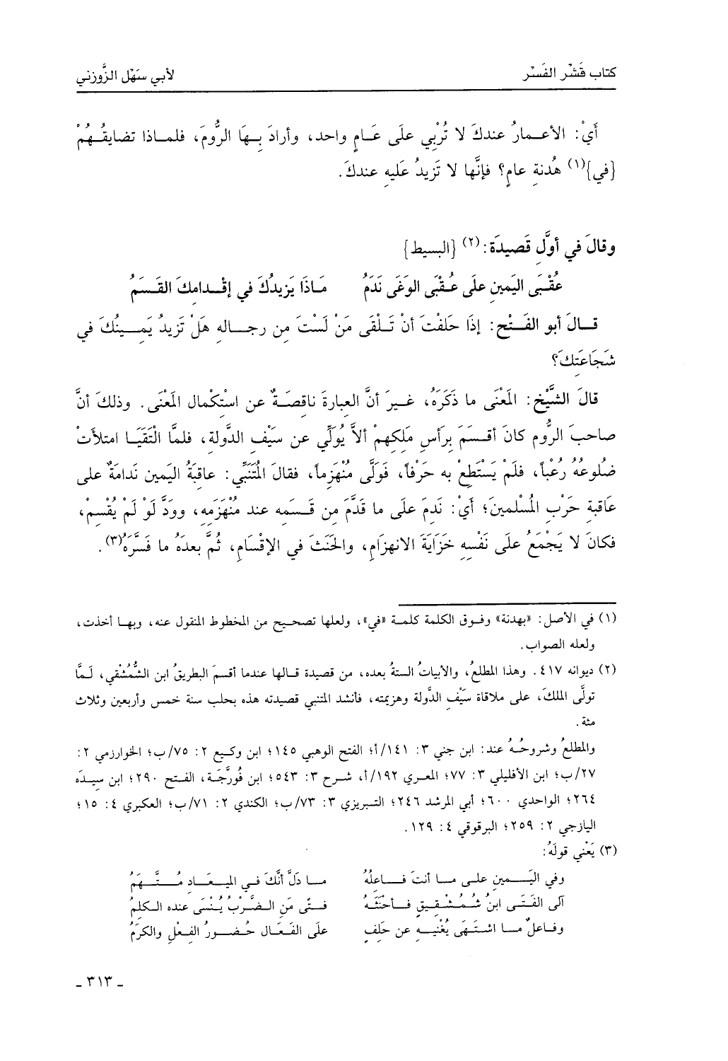 فلم يستطع به حرفاً، فولَّى منهزماً، فقال المتنبي: عاقبة اليمين ندامةٌ على عاقبة حرب المسلمين، أي: ندم على ما قدَّم من قسمه عند منهزمه، وودَّ لو لم يقسم، فكان لا يجمع على نفسه خزاية الانهزام والحِنث في الإقسام، ثم بعده ما فسره.