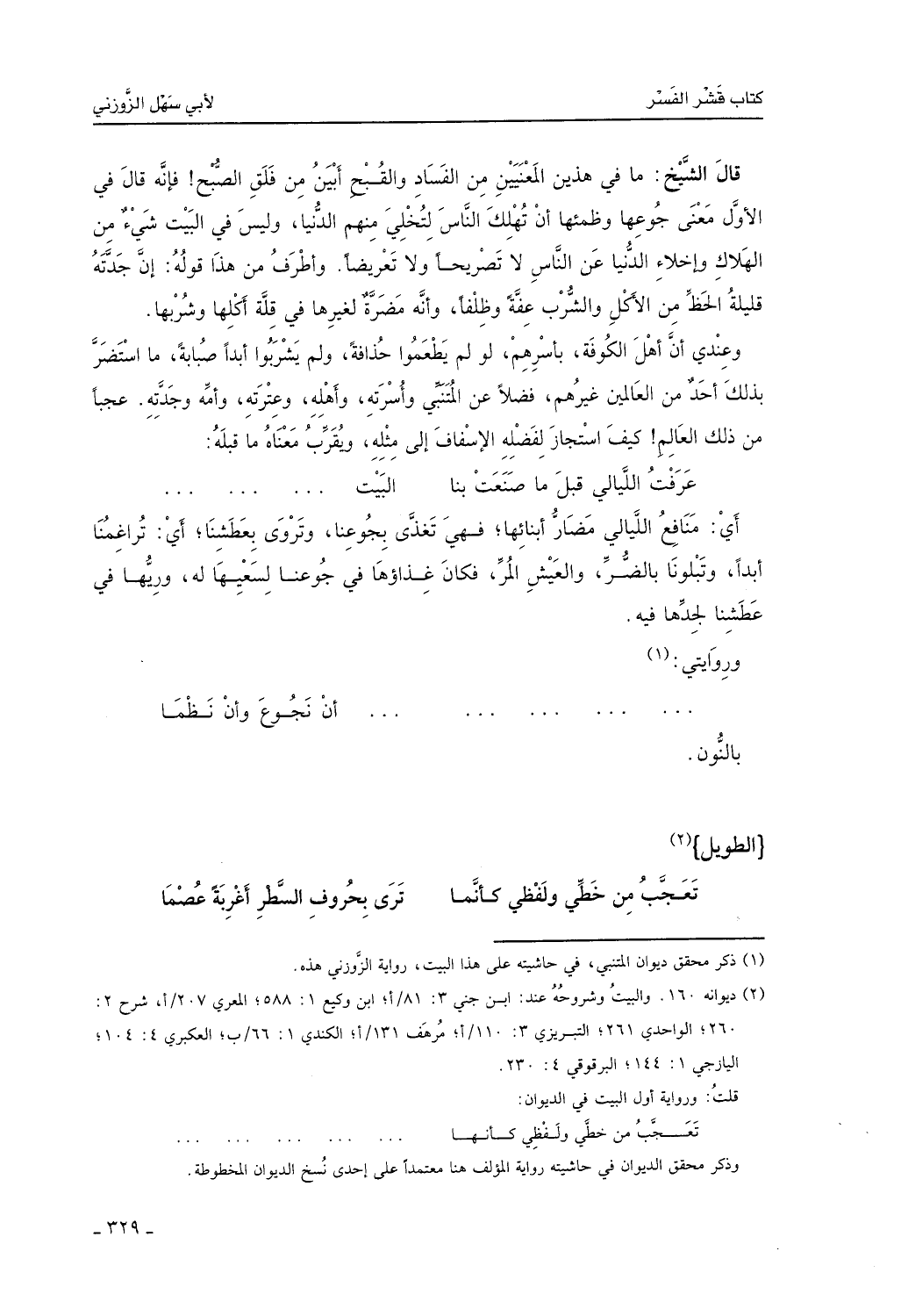 قال الشيخ: ما في هذين المعنيين من الفساد والقُبح أبين من فلق الصُّبح، فإنه قال في الأول: معنى جوعها وظمئها أن تهلك الناس لتخلّى منهم الدُّنيا، وليس في البيت شيء من الهلاك وإخلاء الدُّنيا عن الناس لا تصريحاً ولا تعريضاً، وأطرف من هذا قوله: إن جدَّته قليلة الحظِّ من الأكل والشُّرب عفَّة وظلفاً، وأنه مضرَّة لغيرها في قلَّة أكلها وشربها.