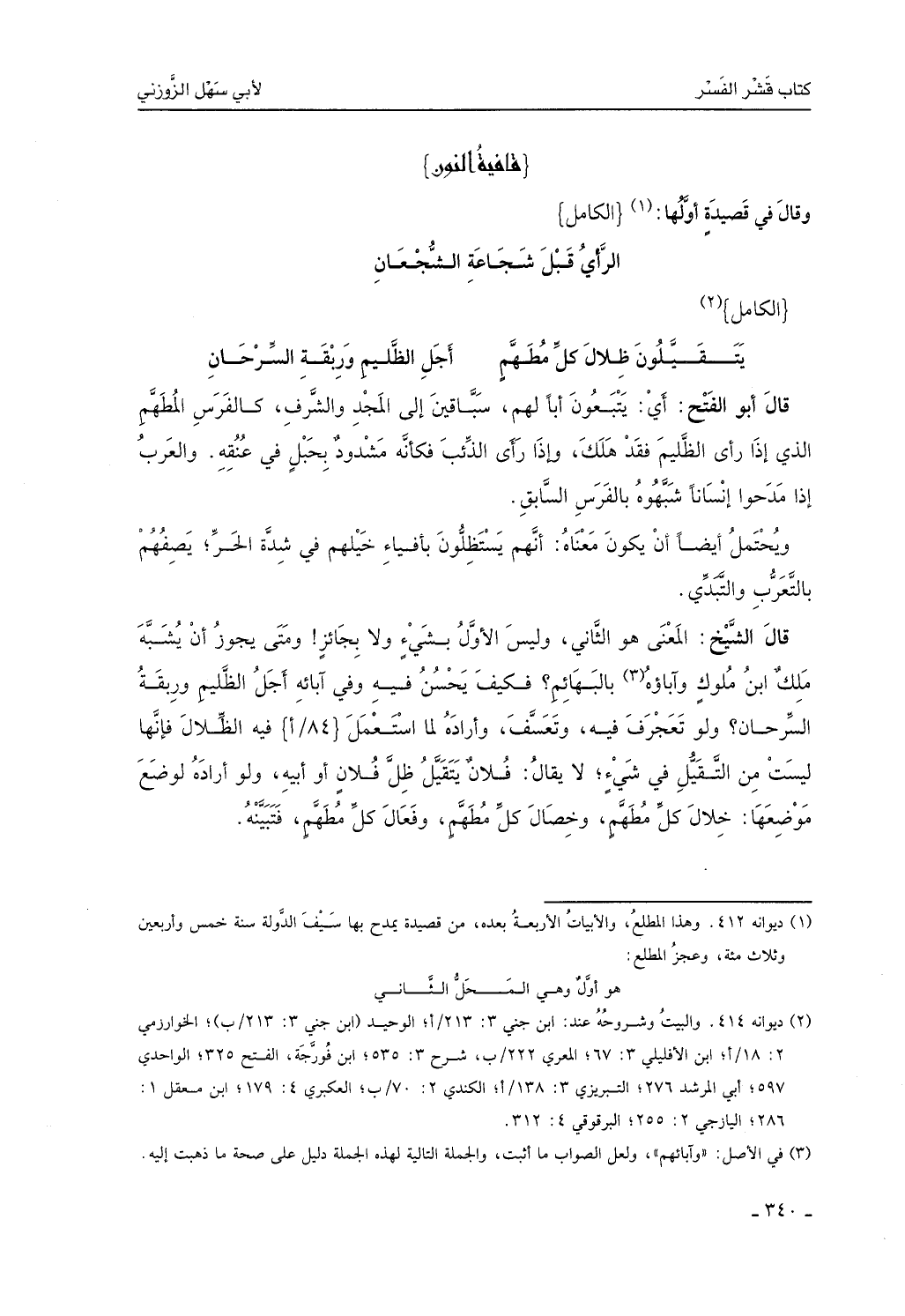 قال الشيخ: المعنى هو الثاني، وليس الأول بشيءٍ، ولا بجائز، ومتى يجوز أن يُشبه ملك ابن ملوك وآباءهم بالبهائم؟ فكيف يحسن فيه وفي آبائه أجل الظَّليم وربقة السِّرحان؟ ولو تعجرف فيه وتعسَّف وأراده لما استعمل فيه الظِّلال، فإنها ليست من التَّقيُّل في شيءٍ، لا يُقال: فلانٌ يتقيَّل ظلَّ فلانٍ أو أبيه، ولو أراده لوضع موضعها خلال كل مطهَّمٍ وخصال كل مطهَّمٍ وفعال كل مطهَّمٍ فتبيَّنه.