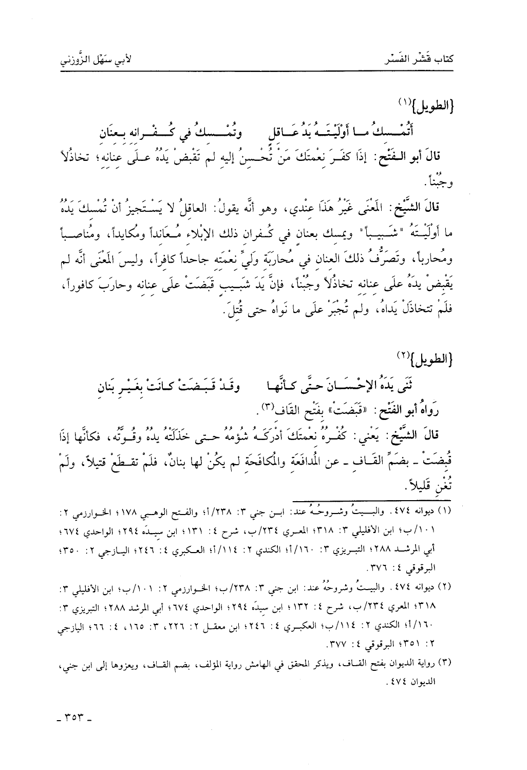 (ثنى يدَه الإحسانُ حتَّى كأنَّها ... وقد قُبِضتْ كانتْ بغيرِ بنانِ)
