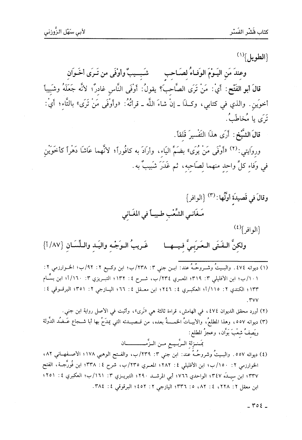 قال أبو الفتح: أي من ترى الصَّاحب؟ يقول: أوفى الناس غادر، لأنه جعله وشبيباً أخوين، والذي في كتابي، وكذا إن شاء الله قرأته، وأوفى من ترى بالتاء، أي ترى يا مخاطب.