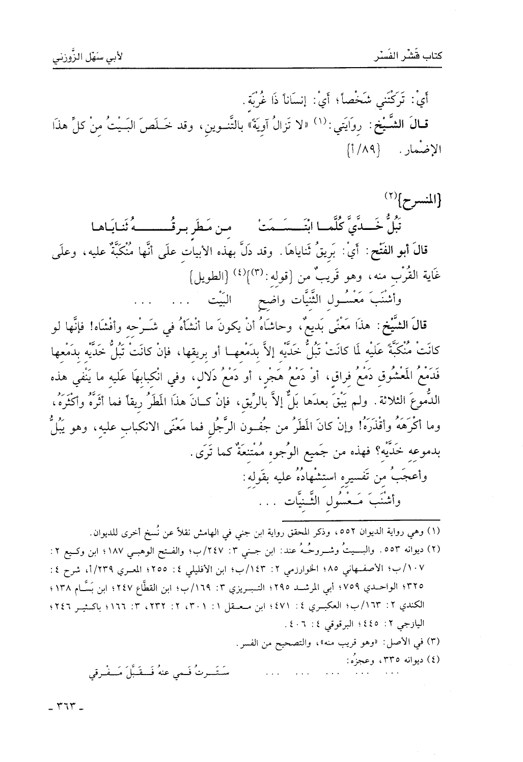 قال الشيخ: روايتي: لا تزال آويةً بالتنوين، وقد خلَّص البيت من كلِّ هذا الإضمار.