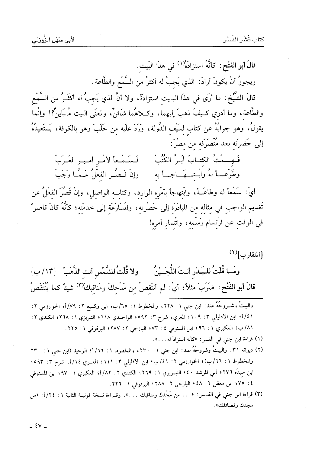 قال أبو الفتح: كأنه استزاده في هذا البيت، ويجوز أن يكون أراد بقوله إن الذي يجب عليه أكثر من السمع والطاعة.