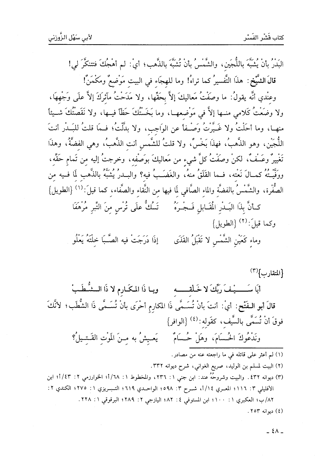 قال الشيخ: هذا التفسير كما تراه، وما للهجاء في البيت موضع ومكمن، وعندي أنه يقول: ما وصفت معاليك إلا بحقها، ولا مدحت مآثرك إلا على وجهها، ولا وضعت كلامي منها إلا في موضعها، وما بخستك حظاً فيها، ولا نقصتك شيئاً منها، وما أحلت ولا غيرت وصفاً عن الواجب، ولا بدلت، فما قلت للبدر: أنت اللُّجين، وهو الذهب، فهذا بخس، ولا قلت للشمس: أنتِ الذهب، وهي الفضة، وهذا تغيير وعسف، لكن وصفت كل شيء من معاليك بوصفه، وخرجت إليه من تمام حقه، ووفيته كمال نعته، فما القلق منه والغضب فيه؟ والبدر يُشبه بالذهب لما فيه من الصفرة والشمس بالفضة والماء الصافي لما فيها من النقاء والصفاء كما قيل: