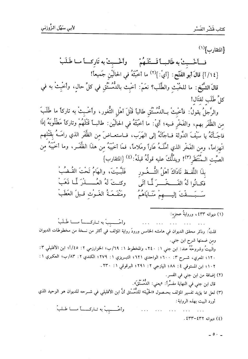 قال الشيخ: ما للخبث والطلب؟ نعم أخبث بالدُّمستق في كل حال، وأخبث به في كل طلب لقتال، والرجل يقول: فأخبث بالدُّمستق طالباً قتل أهل الثُّغور، وأخبث به تاركاً ما طلب من الظفر بهم والفخر فيه، أي: ما أخيبه في الحالين طالباً قتلهم وتاركاً مطلوبه إذا فاجأته يا سيف الدولة فألجأته إلى الهرب، فاستعاض من الظفر الذي رامه بقتلهم انهزاماً ومن الفخر الذي أمله عاراً وملاماً، فما أخيبه من هذا الظفر وما أخيبه من الصيت المنتظر، ويدلك عليه قوله قبله: