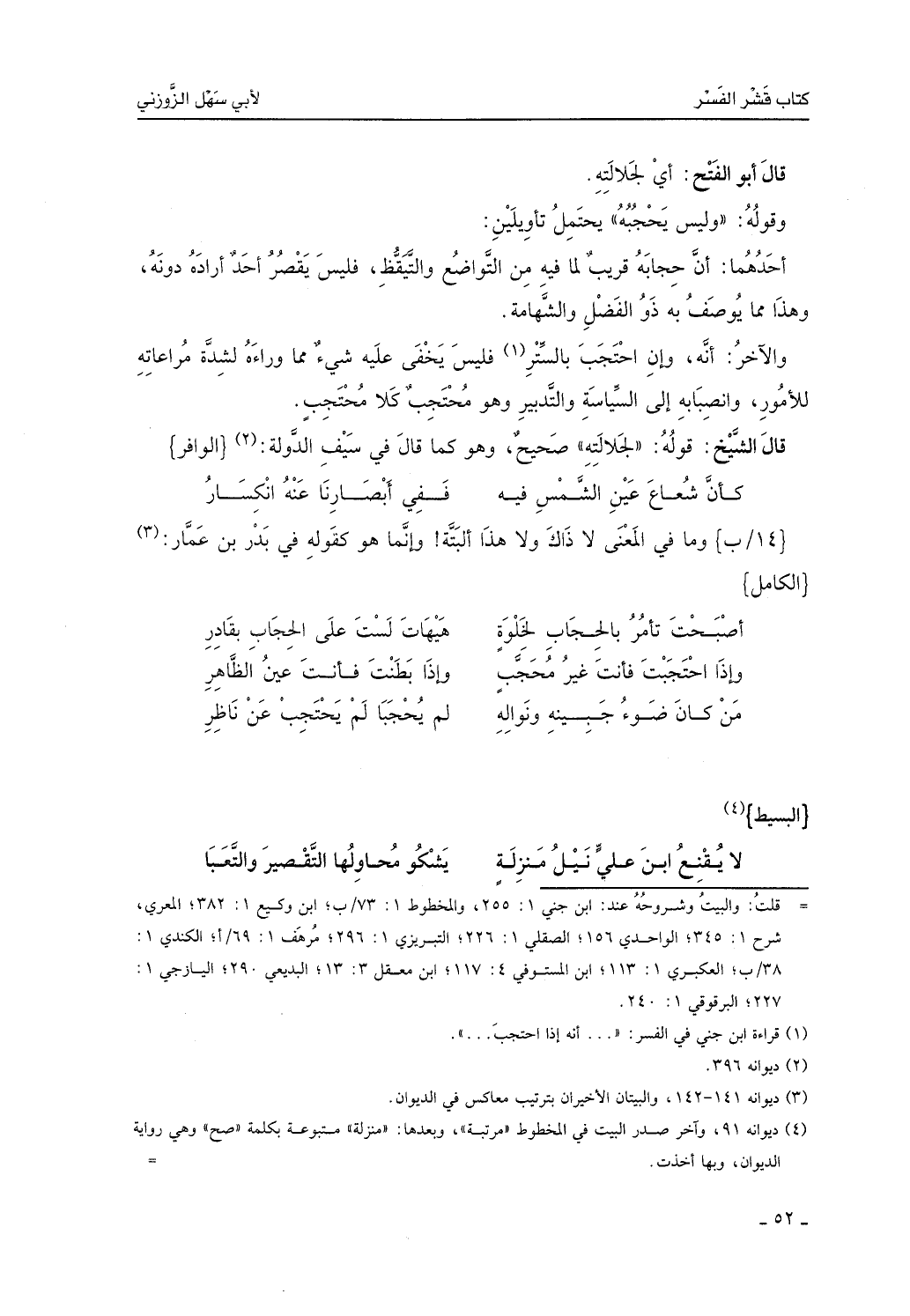 قال أبو الفتح: أي لجلالته، وقوله: وليس يحجبه، يحتمل تأويلين: أحدهما أن حجابه قريب لما فيه من التواضع والتيقظ، فليس يقصر أحد أراده دونه، وهذا مما يُوصف به ذو الفضل والشهامة. والآخر أنه وإن احتجب بالستر فليس يخفى عليه شيء مما وراءه لشدة مراعاته للأمور وانصبابه إلى السياسة والتدبير، وهو محتجب كلا محتجب.