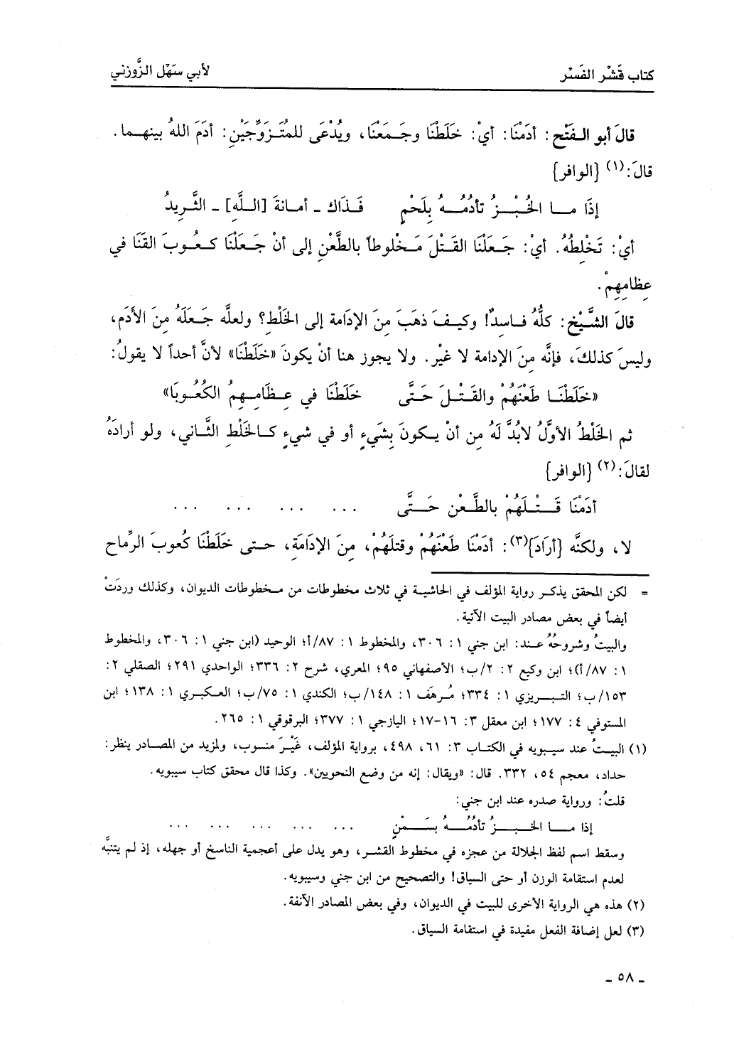 أي: تخلطه، أي جعلنا القتل مخلوطاً بالطعن إلى أن جعلنا كعوب القنا في عظامهم. قال الشيخ: كله فاسد، وكيف ذهب من الإدامة إلى الخلط؟ ولعله جعله من الأدم، وليس كذلك فإنه من الإدامة لا غير، ولا يجوز هنا أن يكون خلطنا، لأن أحداً لا يقول: خلطنا طعنهم والقتل حتى خلطنا في عظامهم الكعوبا، ثم الخلط الأول لابد له من أن يكون بشيء أو في شيء كالخلط الثاني، ولو أراده لقال: أدمنا قتلهم بالطعن حتى لا، ولكنه أدمنا طعنهم وقتلهم من الإدامة حتى خلطنا كعوب الرماح
