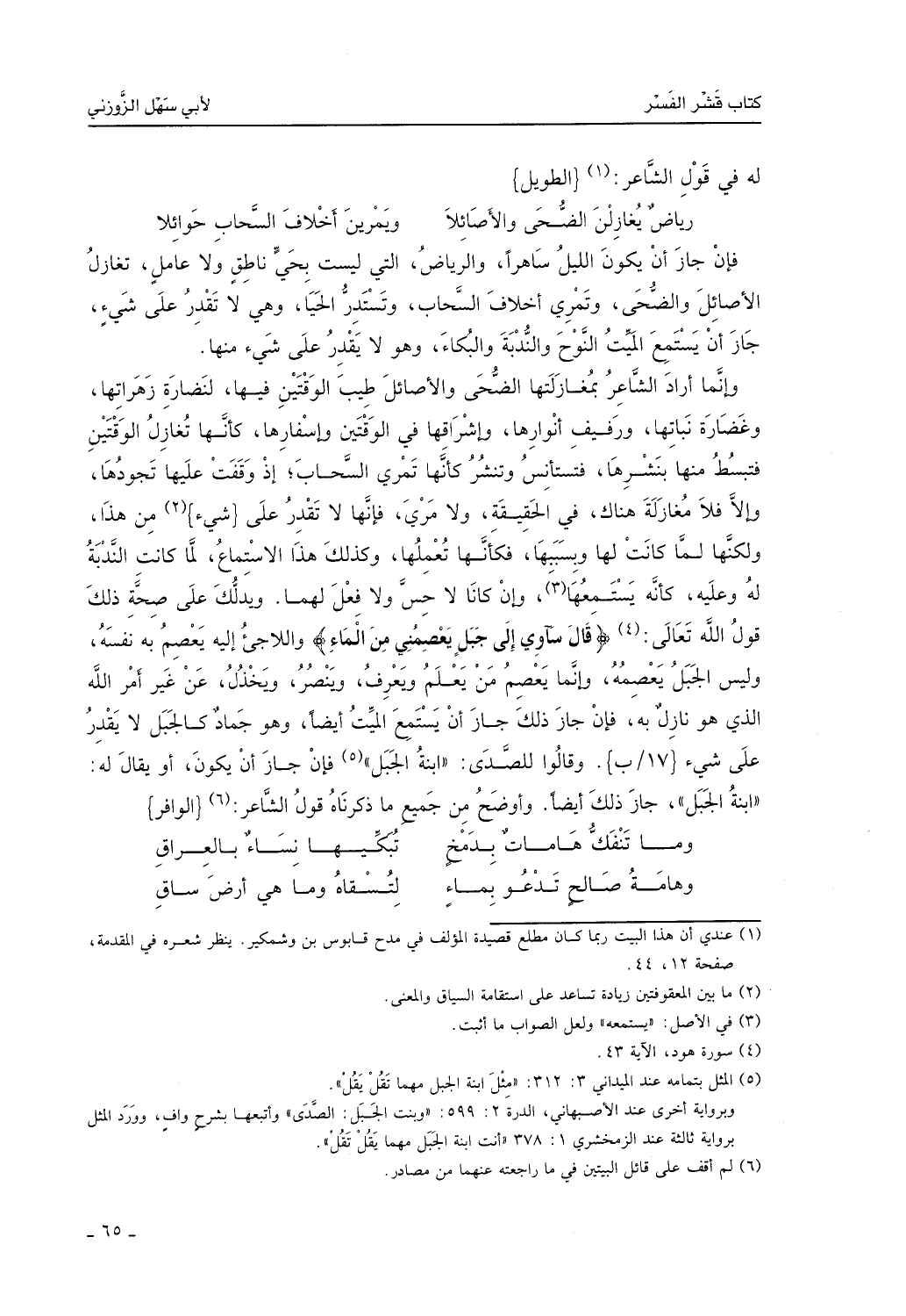 فإن جاز أن يكون الليل ساهراً والرياض التي ليست بحي ناطق ولا عامل تغازل الأصائل والضحى، وتمري أخلاف السحاب، وتستدر الحيا، وهي لا تقدر على شيء جاز أن يستمع الميت النوح والندبة والبكاء، وهو لا يقدر على شيء منها، وإنما أراد الشاعر بمغازلتها الضحى والاصائل طيب الوقتين فيها لنضارة زهراتها وغضارة نباتها ورفيف أنوارها وإشراقها وإسفارها، كأنها تغازل الوقتين، فتبسط منهما بنشرها فتستأنس وتنشر كأنها تمري السحاب إذا وقفت عليها تجودها، وإلا فلا مغازلة هناك في الحقيقة ولا مري، فإنها لا تقدر على شيء من هذا، ولكنها لما كانت لها وتسببها فكأنها تعلمها، كذلك هذا الاستماع لما كانت الندبة له وعليه كأنه تسمعه وإن كانا لا حس ولا فعل لهما، ويدلك عل صحة ذلك قول الله تعالى: (سآوي إلى جبلٍ يعصمني منَ الماءِ)، واللاجئ إليه يعصم به نفسه، وليس الجبل يعصمه، وإنما يعصم من يعلم ويعرف وينصر ويخذل عن غير أمر الله الذي هو نازل به، فإن جاز ذلك جاز أن يستمع الميت أيضاً، وهو جماد كالجبل لا يقدر على شيء، وقالوا للصدى: ابنة الجبل، فإن جاز أن يكون أو يقال له: ابنة الجبل جاز ذلك أيضاً، وأوضح من