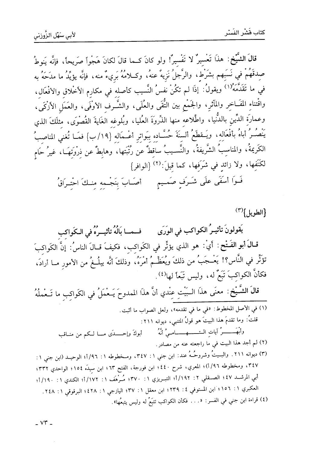 قال الشيخ: معنى هذا البيت عندي أن هذا الممدوح يعمل في الكواكب ما تعلمه