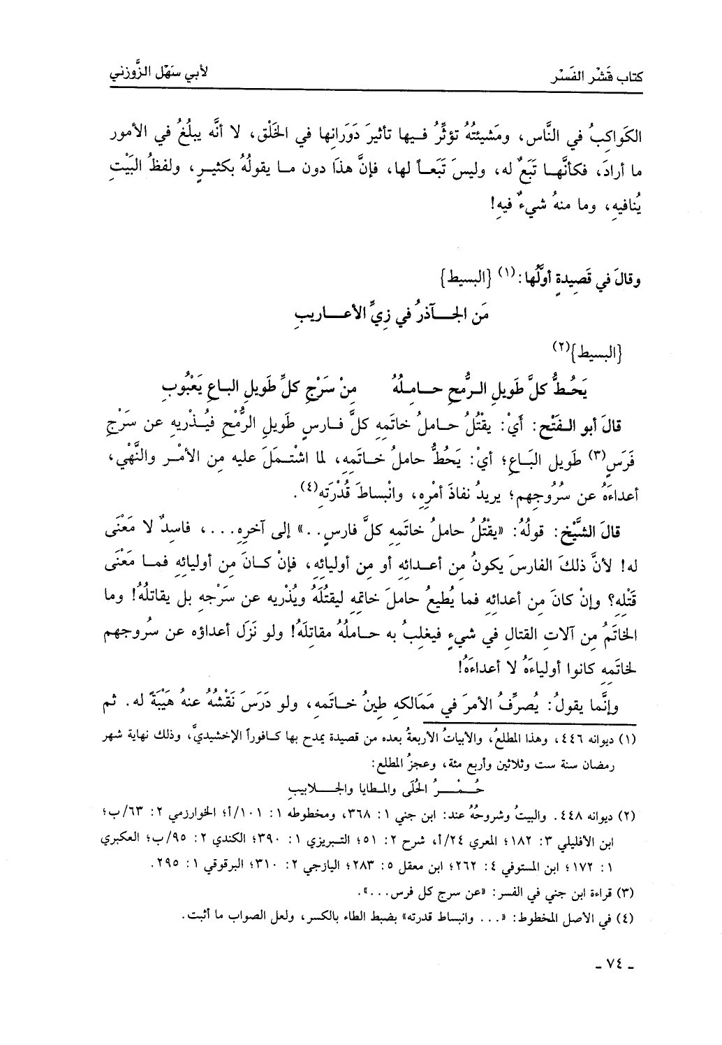 قال الشيخ: قوله يقتل حامل خاتمه كل فارس. . . إلى آخره، فاسد لا معنى له، لأن الفارس يكون من أعدائه أو من أوليائه، فإن كان من أوليائه فما معنى قتله؟ وإن كان من أعدائه فما يُطيع حامل خاتمه ليقتله ويذريه عن سرجه بل يقاتله، وما الخاتم من آلات القتال في شيء فيغلب به حامله مقاتله، ولو نزل أعداؤه عن سروجهم لخاتمه كانوا أولياءه لا أعداءه، وإنما يقول: يُصرف الأمر في ممالكه طين خاتمه، ولو درس نقشه عنه هيبة له، ثم