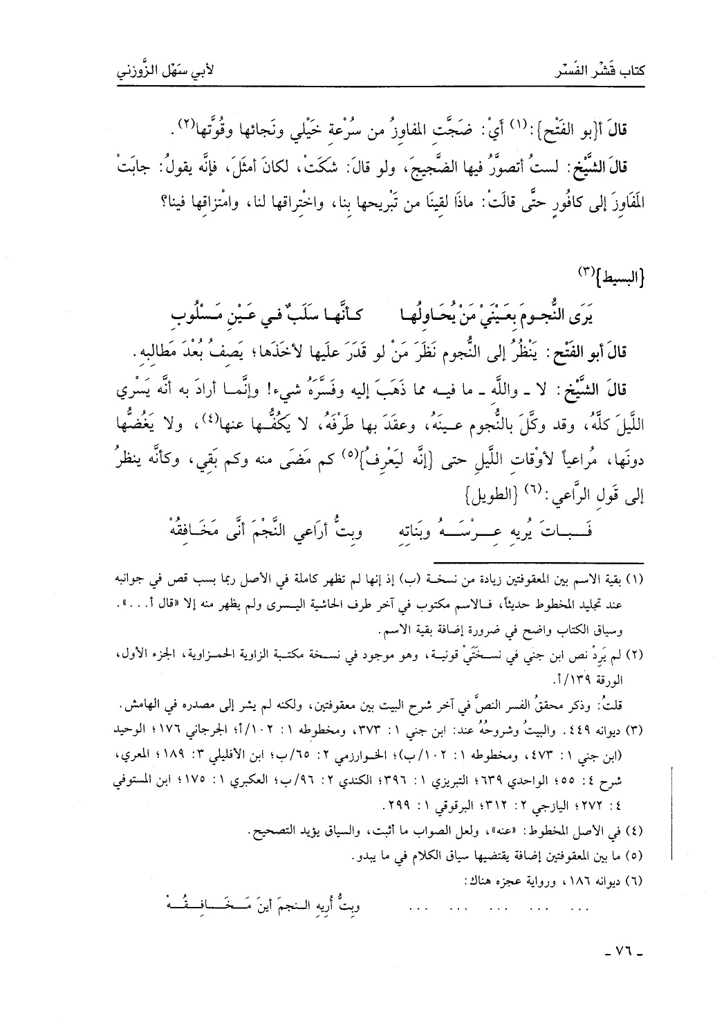 قال الشيخ: لا والله ما فيه مما ذهب إليه وفسره شيء، وإنما أراد به أنه يسري الليل كله، وقد وكل بالنجوم عينه، وعقد بها طرفه، لا يكفها عنه، ولا يغضها دونها مراعياً لأوقات الليل حتى كم مضى منه وكم بقي، وكأنه ينظر إلى قول الراعي:
