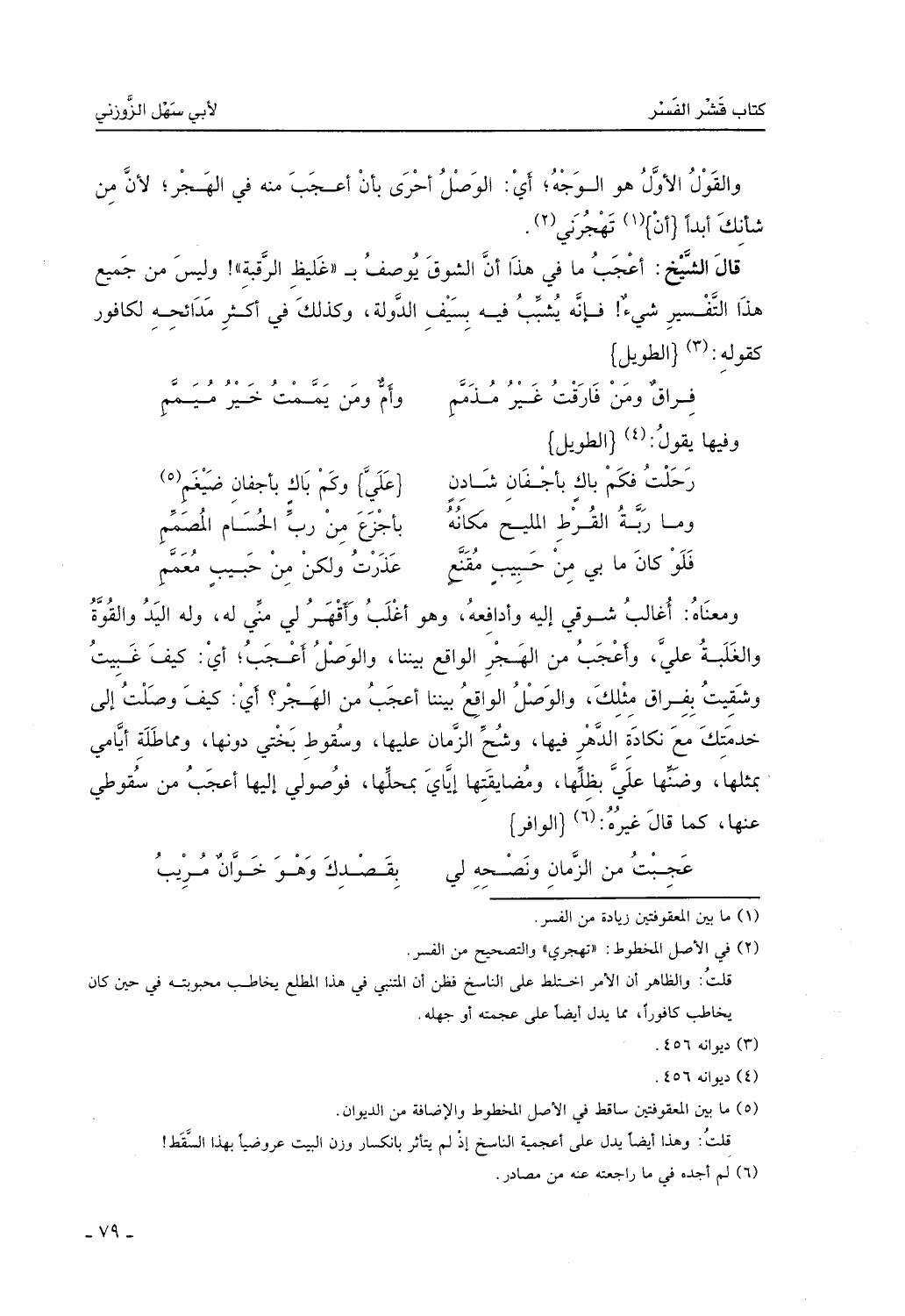 قال الشيخ: أعجب ما في هذا أن الشوق يوصف بغليظ الرقبة، وليس من جميع هذا التفسير شيء، فإنه يُشبب فيه بسيف الدولة، وكذلك في أكثر مدائحه لكافور، كقوله:
