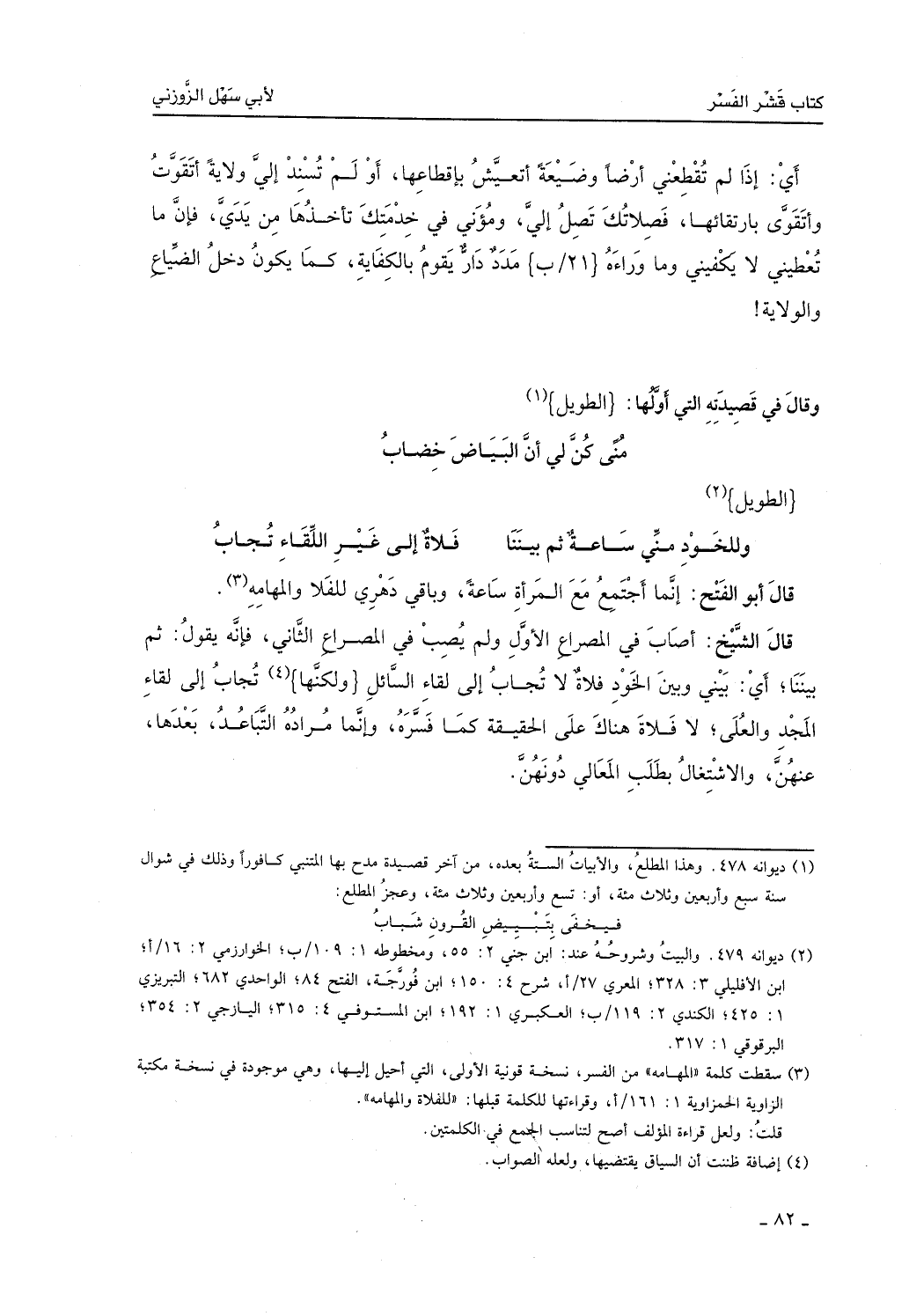 قال الشيخ: أصاب في المصراع الأول، ولم يُصب في المصراع الثاني، فإنه يقول: ثم بيننا، أي: بيني وبين الخود فلاة لا تُجاب إلى لقاء السائل، تُجاب إلى لقاء المجد والعلاء، ولا فلاة هناك على الحقيقة كما فسره، وإنما مراده التباعد بعدها عنهن، والاشتغال بطلب المعالي دونهن.