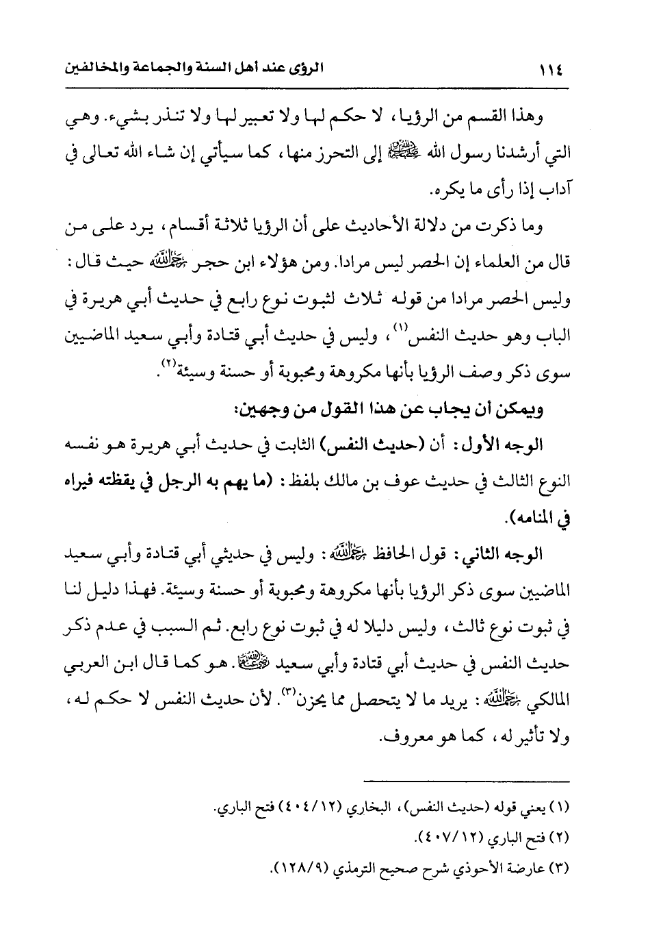 الوجه الثاني: قول الحافظ رحمه الله: وليس في حديثي أبي قتادة وأبي سعيد الماضيين سوى ذكر الرؤيا بأنها مكروهة ومحبوبة أو حسنة وسيئة، فهذا دليل لنا في ثبوت نوع ثالث، وليس دليلاً له في ثبوت نوع رابع، ثم السبب في عدم ذكر حديث النفس في حديث أبي قتادة وأبي سعيد رضي الله عنهما، هو كما قال ابن العربي المالكي رحمه الله: يريد ما لا يتحصل مما يحزن (¬3) لأن حديث النفس لا حكم له، ولا تأثير له، كما هو معروف.