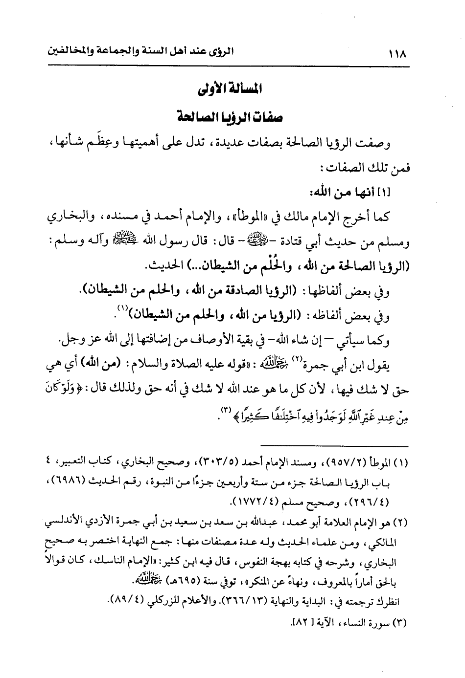 (¬1) الموطأ (2/ 957) ومسند الإمام أحمد (5/ 303) وصحيح البخاري كتاب التعبير باب الرؤيا الصالحة جزء من ستة وأربعين جزءًا من النبوة، (6986) (4/ 296) وصحيح مسلم (4/ 1772).